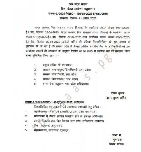- महंगाई भत्ते की एरियर राशि का भुगतान मार्च 2025 के देय वेतन के भुगतान के उपरांत ही किया जाये। एरियर्स के देयक उसी कार्यालय द्वारा बनाये जायेंगे जहाँ से उक्त अवधि के लिए संबंधित अधिकारी का वेतन आहरित किया गया हो।