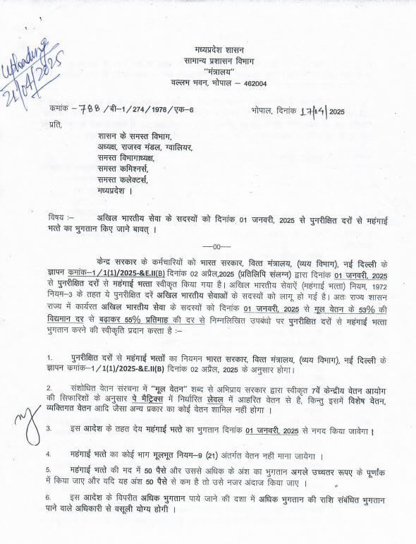 प्रदेश की मोहन यादव सरकार ने अक्षय तृतीया से पहले अखिल भारतीय सेवा के अफसरों का 2 फीसदी महंगाई भत्ता बढ़ा दिया है, जिसके बाद डीए 53 फीसदी से बढ़कर 55 प्रतिशत हो गया है।नई दरें जनवरी 2025 से लागू होंगी ऐसे में 3 महीने का एरियर भी मिलेगा। इस संबंध में मुख्य सचिव अनुराग जैन ने आदेश जारी कर दिया है।