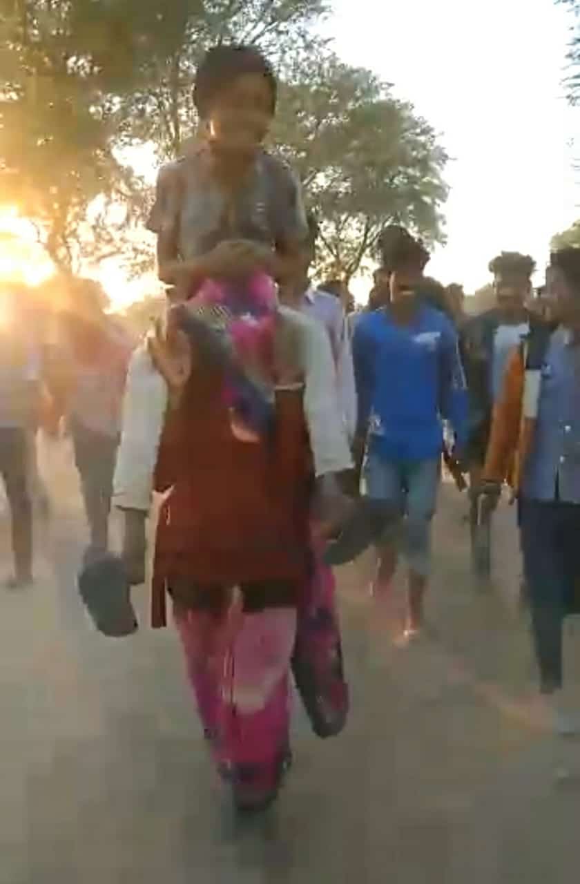 सोशल मीडिया पर कुछ वीडियो वायरल (video viral) हो रहे हैं और एक महिला के कंधे पर कोई व्यक्ति बैठा (boy sitting on the shoulder) हुआ है। वो उसे जानवरों की तरह हांकते हए कहीं ले जा रहे हैं। जानकारी के मुताबिक ये घटना गुना जिले के सिरसी थाना क्षेत्र के ग्राम सागई और बाँसखेडी का है। पीड़ित महिला आदिवासी भील समाज (bhil tribe) से ताल्लुक रखती है। बताया जा रहा है कि उसकी शादी बाँसखेडी गांव में हुई थी और मायका ग्राम दगड़फला ग्राम पंचायत राय बमोरी विधानसभा का है। कहा जा रहा है कि उसका पति उसे छोड़कर किसी और महिला के साथ रहना चाहता था। उनके समाज की रीत के अनुसार ऐसा होने पर पति पत्नी आपसी सहमति से अलग हो जाते हैं। पति द्वारा किसी और महिला के साथ रहने की बात कही जाने पर पत्नी (पीड़िता) भी उससे सहमत होकर मैं अपने विवाहित पति को छोड़ एक अन्य युवक के साथ ग्राम सागई में रहने लगी। पीड़ित महिला का कहना है कि वो करीब एक महीने से दूसरे युवक के साथ पत्नी के रूप में रह रही थी। अचानक 9 फरवरी को पूर्व ससुराल वाले लोग आए जिनमें ससुर और जेठ ससुर के लड़के शामिल, वो महिला के घर पहुंचे और उसे मुझे मारते पीटते हुए पूर्व सुसराल बांसखेड़ी तक जबरदस्ती ले गए। बात केवल इतनी ही नहीं है, सागई गांव से बांसखेड़ी का रास्ता 3 किलोमीटर का है और इस दौरान पीड़िता के कंधे पर उसके रिश्ते के एक जेठ को बैठा दिया गया। अपने जेठ को कंधे पर लादे हुए महिला को जानवरों की तरह लकड़ी से हांकते हुए और पीटते हुए पूर्व ससुराल तक लाया गया। इस दौरान उनके साथ अच्छी खासी भीड़ चल रही थी और महिला की मदद करने की बजाय लोग उसका मजाक बना रहे थे।