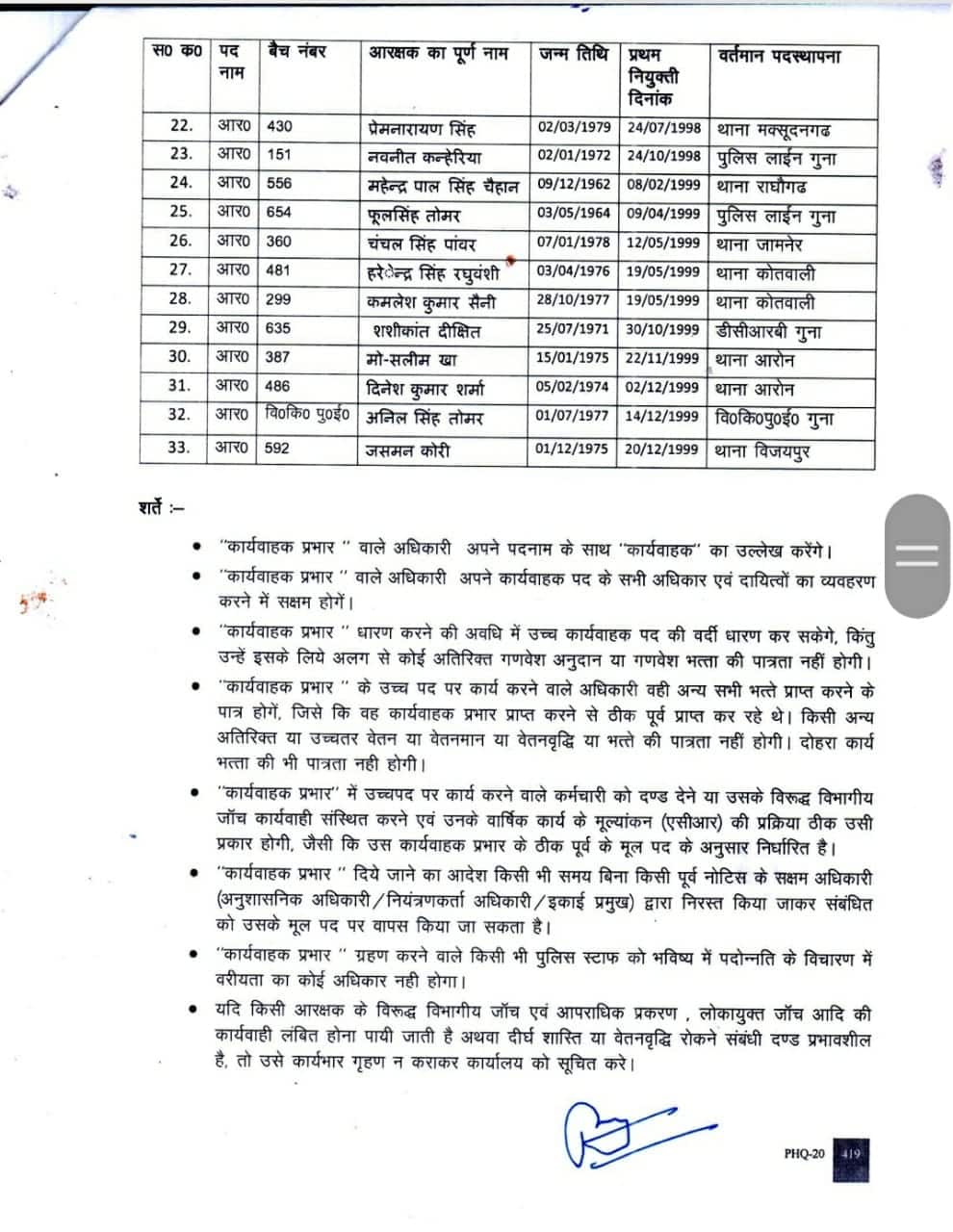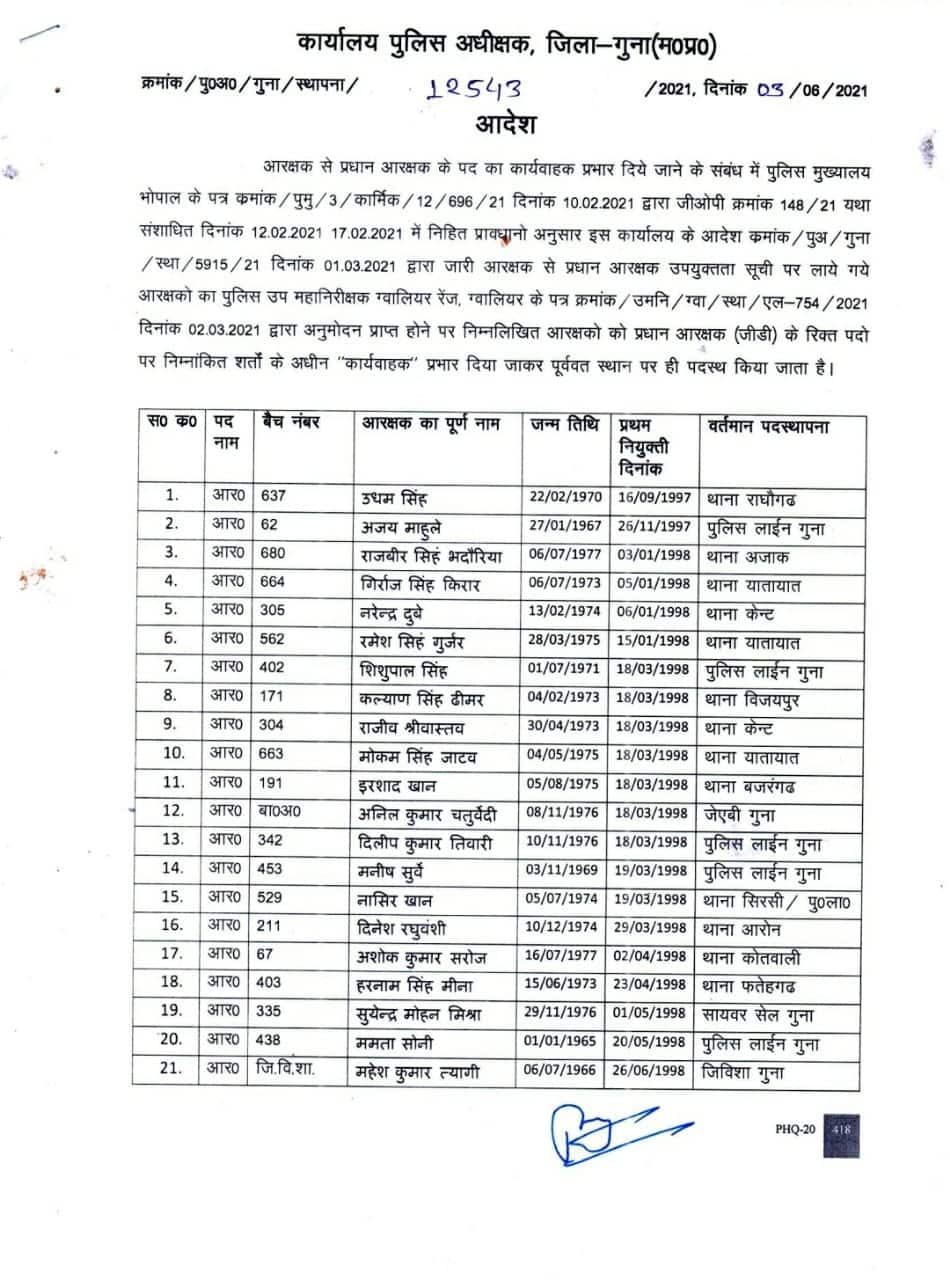 एसपी द्वारा जारी आदेश में जिन आरक्षकों को कार्यवाहक प्रधान आरक्षक का दायित्व सौंपा है। उनमें ऊधम सिंह थाना राघौगढ़, अजय माहुले पुलिस लाईन, राजवीर सिंह भदौरिया थाना अजाक, गिर्राज सिंह किरार थाना यातायात, नरेंद्र दुबे थाना कैंट, रमेश सिंह गुर्जर थाना यातायात, शिशुपाल सिंह पुलिस लाईन, कल्याण सिंह ढीमर थाना विजयपुर, राजीव श्रीवास्तव थाना कैंट, मोकम सिंह जाटव थाना यातायात, इरशाद खान थाना बजरंगगढ़, अनिल कुमार चतुर्वेदी जेएबी गुना, दिलीप कुमार तिवारी पुलिस लाईन गुना, मनीष सुर्वे पुलिस लाईन, नासिर खान थाना सिरसी, दिनेश रघुवंशी थाना आरोन, अशोक कुमार सरोज थाना कोतवाली, हरनाम सिंह मीना थाना फतेहगढ़, सूर्येन्द्र मोहन मिश्रा सायबल सेल गुना, ममता सोनी, पुलिस लाईन गुना, महेश कुमार त्यागी जिला विशेष शाखा गुना, प्रेमनारायण सिंह थाना मक्सूदनगढ़, नवनीत कन्हेरिया पुलिस लाईन गुना, महेंद्र पाल सिंह चौहान थाना राघौगढ़, फूलसिंह तोमर पुलिस लाईन गुना, चंचल सिंह पंवार थाना जामनेर, हरेंद्र सिंह रघुवंशी थाना कोतवाली, कमलेश कुमार सैनी थाना कोतवाली, शशिकांत दीक्षित डीसीआरबी, मो. सलीम थाना आरोन, दिनेश कुमार शर्मा थाना आरोन, अनिल सिंह तोमर थाना आरोन, जसमन कोरी थाना विजयपुर शामिल हैं।