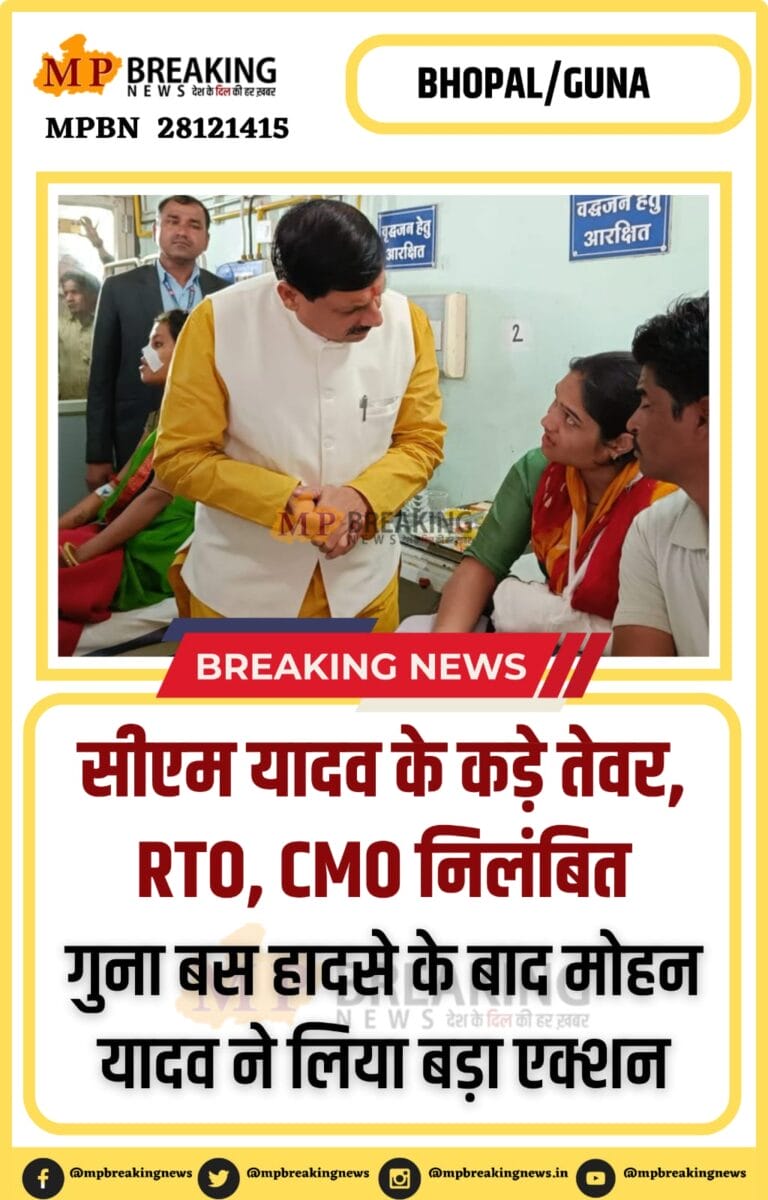 Guna bus accident : गुना जिले की सेमरी घाटी पर बीती रात हुई ह्रदय विदारक सड़क दुर्घटना के घायलों के हालचाल जानने के लिए मुख्यमंत्री डॉ मोहन यादव भोपाल से गुना पहुंचे, उन्होंने अस्पताल में भर्ती मरीजों से घटना के बारे में जानकारी ली और फिर उनके इलाज को लेकर प्रशासन की कड़े निर्देश दिए, घायलों से बात करने के बाद मुख्यमंत्री ने गुना जिले के RTO और सीएमओ को निलंबित करने के आदेश दे दिए ।