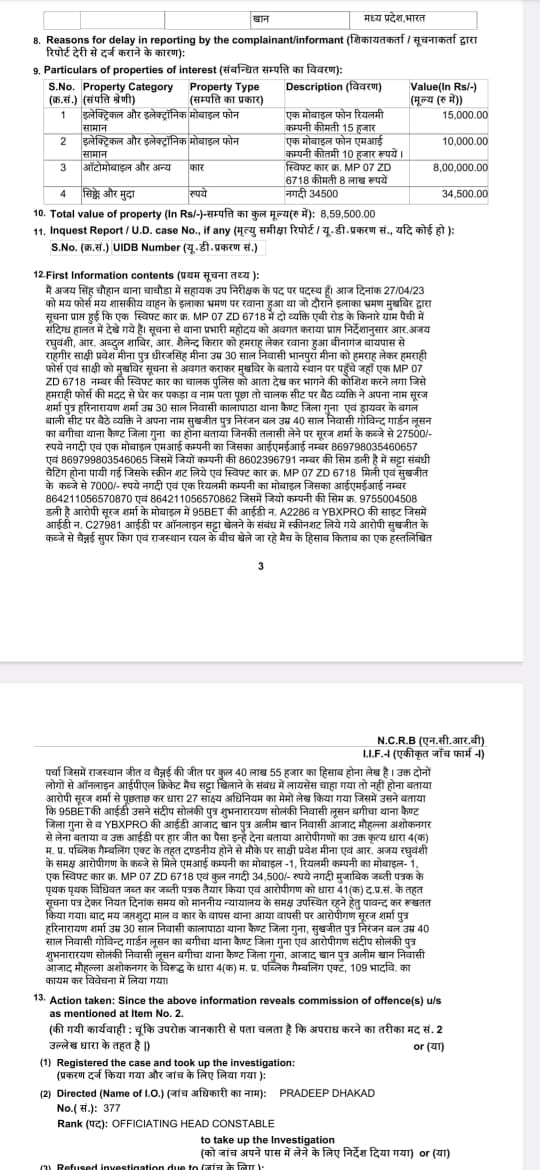 IPL Betting in Guna : गुना जिले की चांचौड़ा पुलिस ने आईपीएल सट्टा से जुड़े एक बड़े मामले का पर्दाफाश किया है। दरअसल, पुलिस ने एबी रोड के किनारे कार में बैठकर मोबाइल के जरिए सट्टा लगवा रहे दो युवकों से पूछताछ की। साथ ही, उनका मोबाइल चैक किया तो उसमें 40 लाख से ज्यादा का लेन-देन सामने आया, जिसके बाद दोनों आरोपियों को गिरफ्तार कर लिया गया है। जिनके पास से करीब 35 हजार नगद बरामद किए हैं।