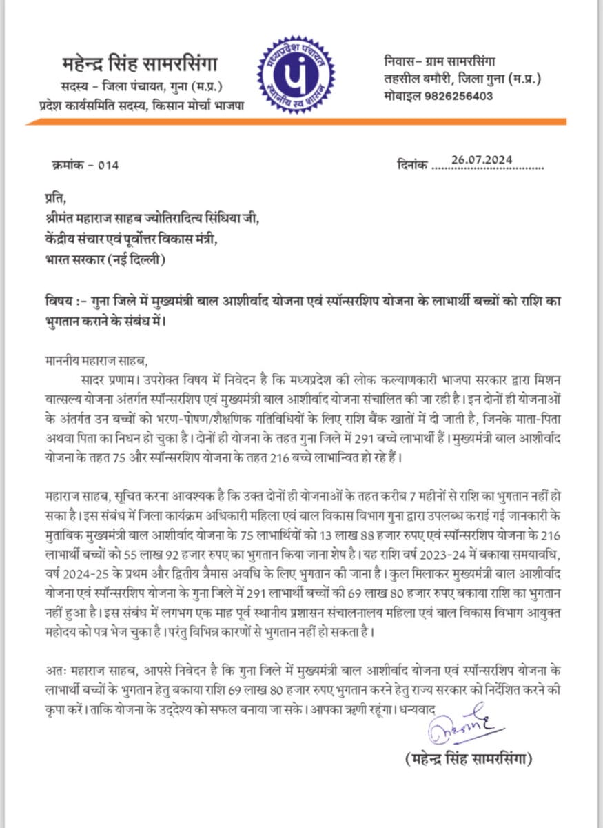 इस पत्र में जिला पंचायत सदस्य और भाजपा किसान मोर्चा प्रदेश कार्यसमिति सदस्य महेन्द्र सिंह सामरसिंगा ने लिखा है कि ‘विषय अंतर्गत निवेदन है कि मध्यप्रदेश की लोक कल्याणकारी भाजपा सरकार द्वारा मिशन वात्सल्य योजना अंतर्गत स्पॉन्सरशिप एवं मुख्यमंत्री बाल आशीर्वाद योजना संचालित की जा रही है। इन दोनों ही योजनाओं के अंतर्गत उन बच्चों को भरण-पोषण/शैक्षणिक गतिविधियों के लिए राशि बैंक खातों में दी जाती है, जिनके माता-पिता अथवा पिता का निधन हो चुका है। दोनों ही योजना के तहत गुना जिले में 291 बच्चे लाभार्थी हैं। मुख्यमंत्री बाल आशीर्वाद योजना के तहत 75 और स्पॉन्सरशिप योजना के तहत 216 बच्चे लाभान्वित हो रहे हैं।’