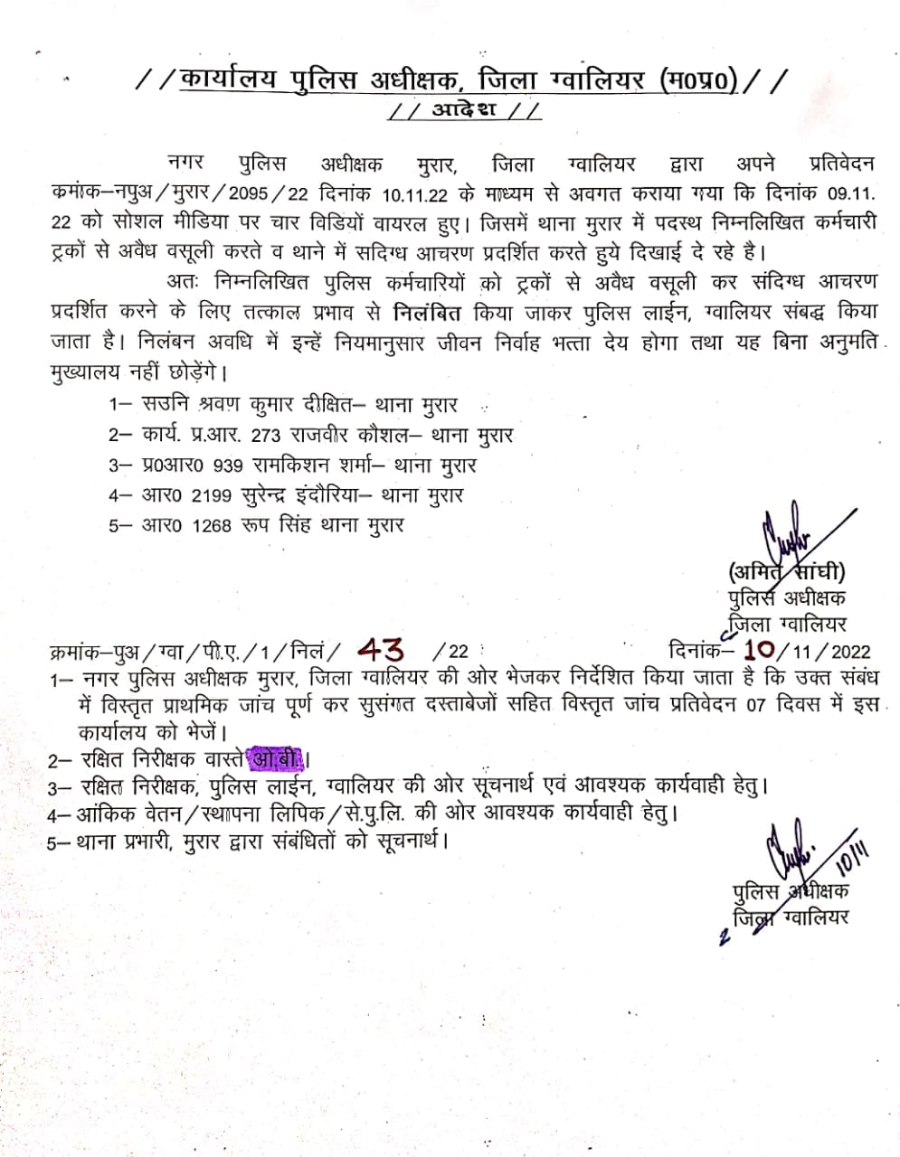 गौरतलब है कि ग्वालियर पुलिस अधीक्षक अमित सांघी (Gwalior SP Amit Sanghi) ने कल 10 नवंबर को एक आदेश जारी कर मुरार थाने के पांच पुलिसकर्मियों को निलंबित किया था। निलंबन का आधार सोशल मीडिया में वायरल हुए एक डंपर से अवैध वसूली के चार वीडियो को बताया गया था। एसपी ने सीएसपी मुरार ऋषिकेश मीणा के प्रतिवेदन के बाद मुरार थाने में पदस्थ कार्यवाहक ASI श्रवण कुमार दीक्षित, कार्यवाहक प्रधान आरक्षक राजवीर कौशल, प्रधान आरक्षक रामकिशन शर्मा, आरक्षक सुरेंद्र इंदौरिया और आरक्षक रूप सिंह को निलंबित कर दिया।