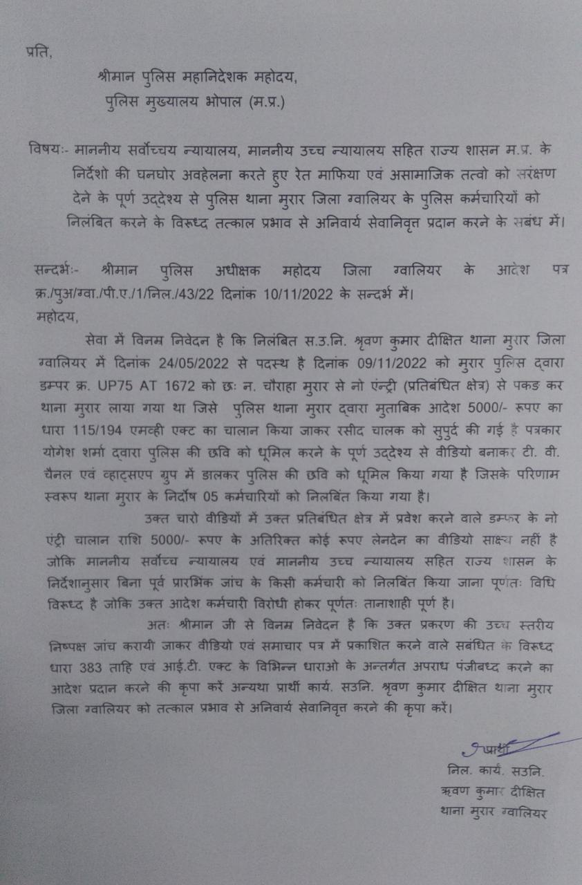 निलंबन के इस आदेश के बाद कार्यवाहक ASI श्रवण कुमार दीक्षित ने पुलिस महानिदेशक को एक पत्र लिखा। DGP को लिखे शिकायती पत्र में निलंबित कार्यवाहक ASI दीक्षित ने लिखा कि 9 नवंबर को मुरार थाना पुलिस द्वारा डंपर क्रमांक UP75 AT 1772 को 6 नंबर चौराहा मुरार से नोइंट्री में पकड़ा था और उसे थाने लेकर आये थे। इसके बाद थाने में धारा 115 /194 मोटर व्हीकल एक्ट के तहत 5000/- चालान बनाया और रसीद चालक को दे दी।