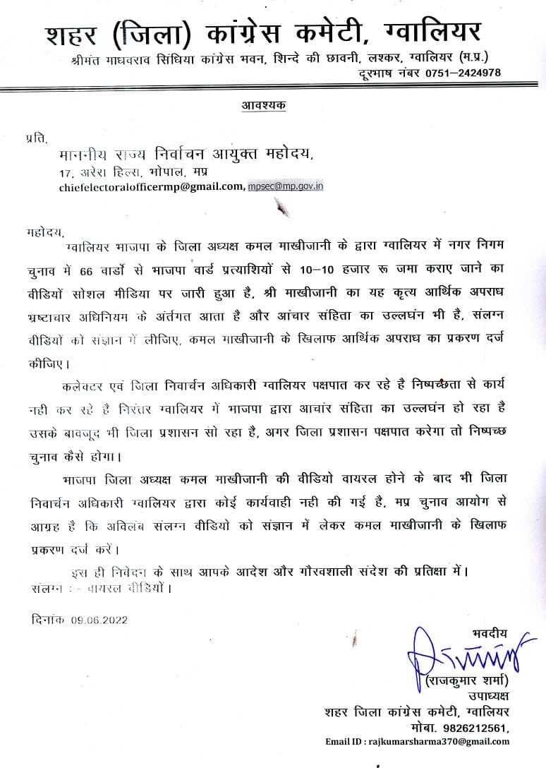 शहर जिला कांग्रेस कमेटी ग्वालियर के उपाध्यक्ष राजकुमार शर्मा (District Congress Committee Gwalior Vice President Rajkumar Sharma) ने मप्र राज्य निर्वाचन आयुक्त को एक शिकायती आवेदन दिया है जिसमें उन्होंने भाजपा जिला अध्यक्ष कमल माखीजानी के एक वायरल वीडियो की शिकायत राज्य निर्वाचन आयुक्त से की है। कांग्रेस नेता राजकुमार शर्मा का आरोप है कि BJP जिला अध्यक्ष दावेदारों से 10 – 10 हजार रुपये बायोडाटा के साथ में मांग रहे हैं , ये आचार संहिता का उल्लंघन है और आर्थिक अपराध की श्रेणी में आता है।