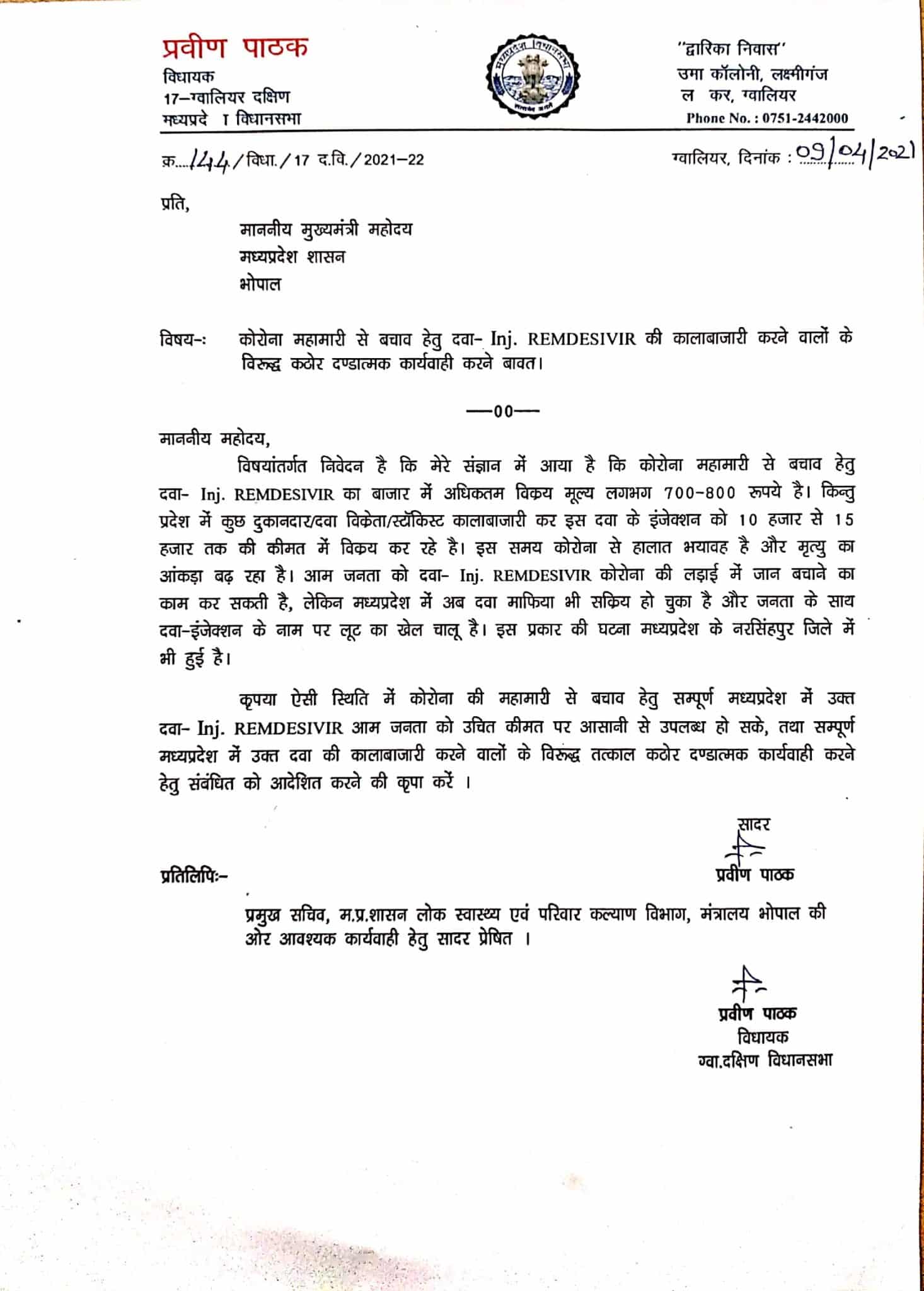 ग्वालियर दक्षिण से कांग्रेस विधायक प्रवीण पाठक ने पत्र में लिखा है कि रेमडेसिविर इंजेक्शन की कालाबाजारी की शिकायतों के बीच इस महामारी से लड़ने वाले मरीजों एवं उनके परिजनों को काफी परेशानी का सामना करना पड़ रहा है। उन्होने रेमडेसिविर की कालाबाजारी करने वालों के विरुद्ध कठोर दंडात्मक कार्रवाई करने की मांग की है।