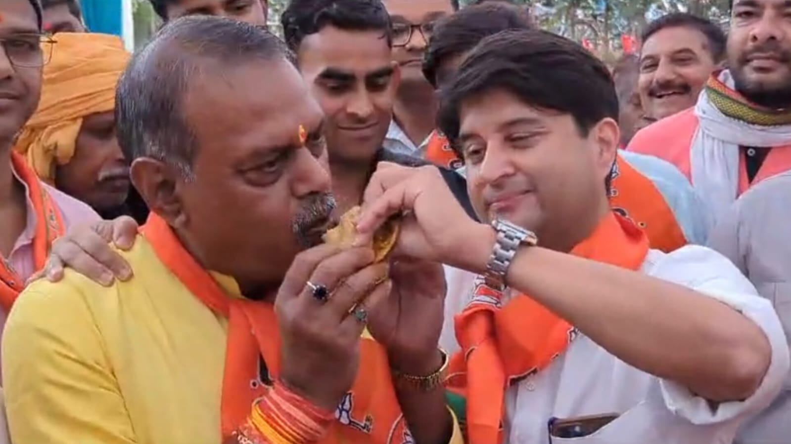 MP Election 2023 : मप्र विधानसभा चुनाव में अलग अलग तस्वीरें सामने आ रही हैं, कहीं प्रत्याशी नामांकन भरने बैलगाड़ी पर जा रहे हैं तो कहीं गधे पर बैठकर, कहीं स्कूटी पर जा रहे है तो कहीं साइकिल पर, ये सभी तस्वीरें और वीडियो सोशल मीडिया पर वायरल हैं अब एक नई तस्वीर वायरल हुई है जिसमें केंद्रीय मंत्री ज्योतिरादित्य सिंधिया पार्टी प्रत्याशी पूर्व मंत्री नारायण सिंह कुशवाह को समोसा खिला रहे हैं, सोशल मीडिया पर वीडियो वायरल हो रहा है।