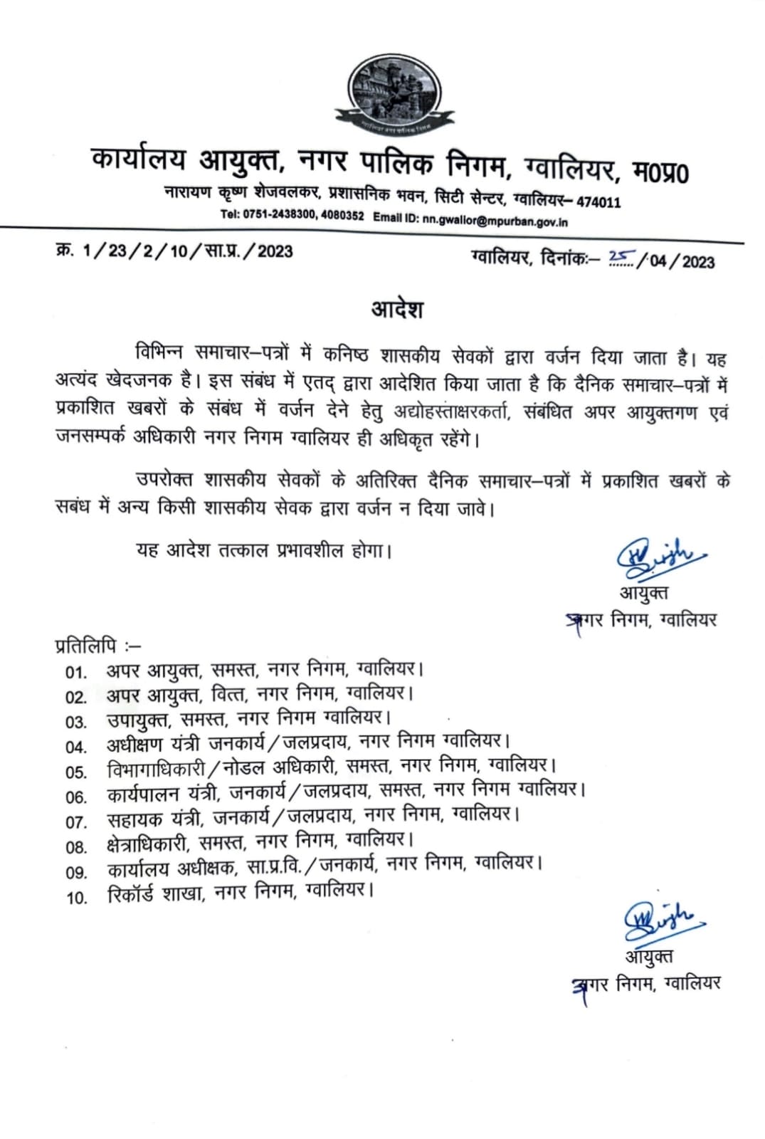 अख़बारों, मीडिया चैनल्स और डिजिटल प्लेटफ़ॉर्म पर ग्वालियर नगर निगम की ख़बरें प्रमुखता से छापी और दिखाई जाती हैं, खबरनवीस यानि पत्रकार अपने सोर्स के आधार पर नगर निगम अधिकारियों, कर्मचारियों की कारगुजारियां शहर की जनता के सामने लाते हैं, इसके लिए वे संबंधित विभाग के अधिकारी या कर्मचारी का वर्जन भी लेते हैं लेकिन अब ऐसा नहीं होगा।