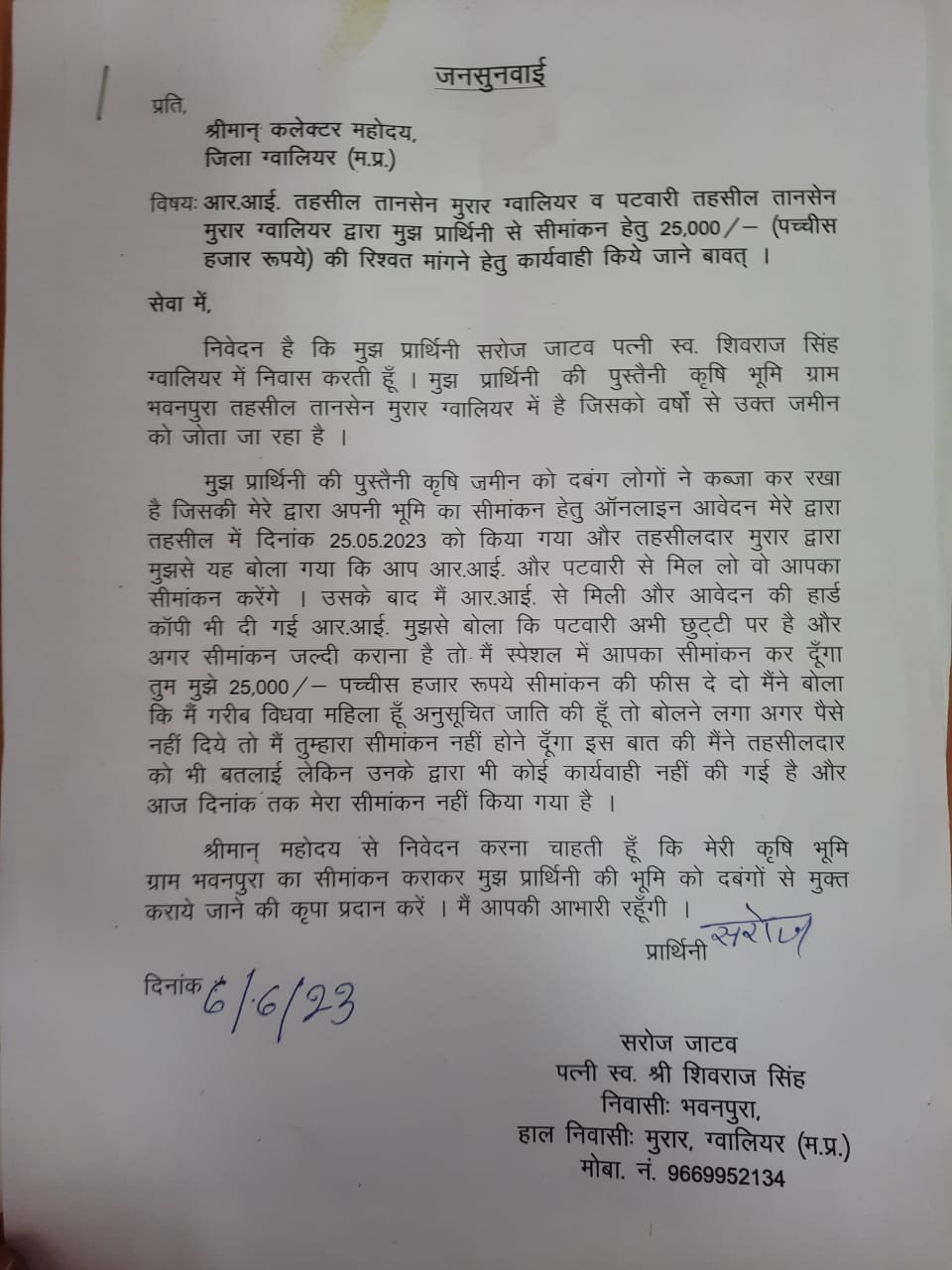 सरोज जाटव ने आवेदन में लिखा कि मैंने आर आई से कहा कि मैं गरीब विधवा हूँ अनुसूचित जाति की हूँ कहाँ से इतना पैसा दूंगी, तो आर आई ने कहा कि यदि पैसा नहीं दोगी तो तुम्हारी जमीन का सीमांकन नहीं होने दूंगा। सरोज ने इस बात की शिकायत तहसीलदार से भी की लेकिन तहसीलदार ने कोई एक्शन नहीं लिया और आज तक जमीन का सीमांकन नहीं हुआ।