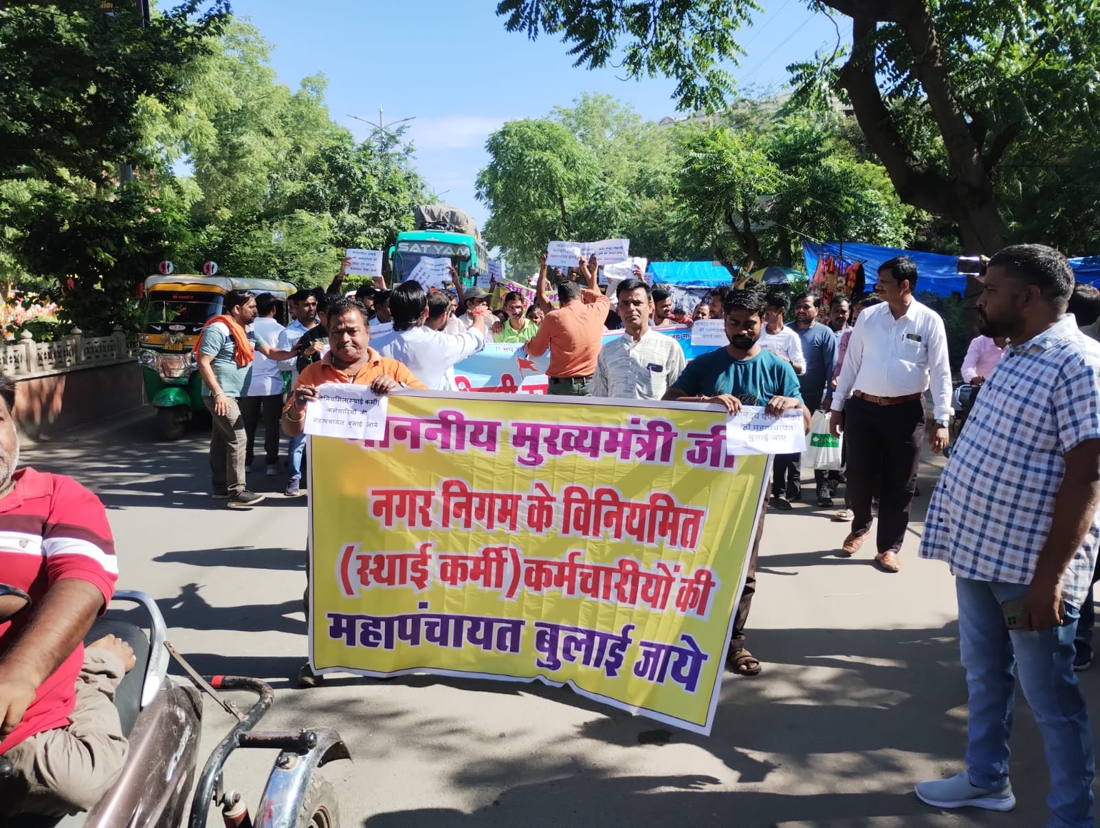 स्वयं सेवक अधिकारी कर्मचारी मध्य प्रदेश के बैनर पर नगर निगम के विनियमित (स्थाई ) कर्मचारियों ने अचलेश्वर महादेव मंदिर से सभापति मनोज तोमर के आम खो कंपू स्थित घर तक रैली निकाली और उनके घर का घेराव करते हुए उन्हें एक ज्ञापन सौंपा, ज्ञापन में कर्मचारियों ने अपील की कि उन्हें मुख्यमंत्री से मिलने का समय दिलवाया जाये जिससे उनका प्रतिनिधिमंडल मुख्यमंत्री से पंचायत बुलाने का निवेदन कर सकें।