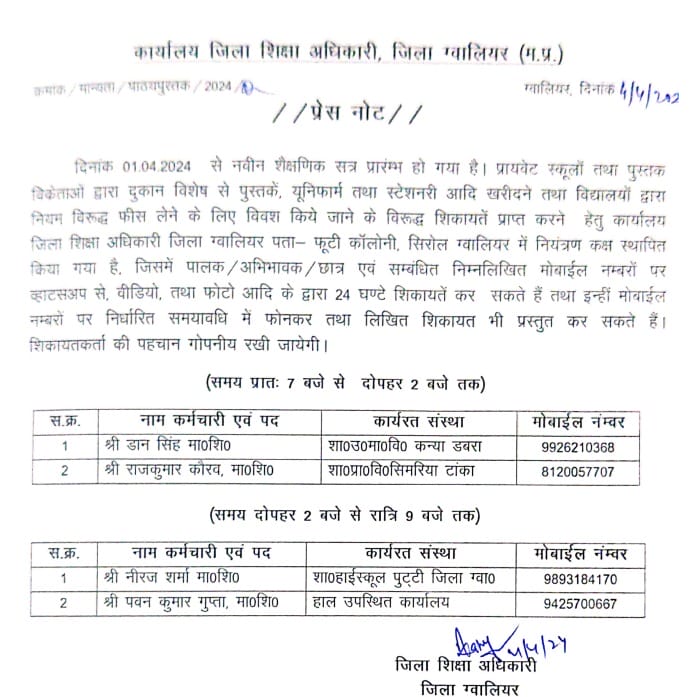 Gwalior News : किताबें कॉपियां, ड्रेस आदि बेचने वाले स्कूलों के खिलाफ सख्त कार्रवाई करने के स्कूल शिक्षा विभाग के निर्देश और मुख्यमंत्री डॉ मोहन यादव के आदेशों का भी कोई असर होता दिखाई नहीं दे रहा है, स्कूल संचालक दुकानदार से सांठगांठ कर बेख़ौफ़ और महँगी कीमत पर स्टेशनरी बेच रहे हैं, कलेक्टर द्वारा बनाई गई एक संयुक्त टीम ने जब शहर के दुकानों का निरीक्षण किया तो उनके सामने ये हकीकत आई, जाँच टीम अब इसकी रिपोर्ट बनाकर कलेक्टर को सौंपेगी।