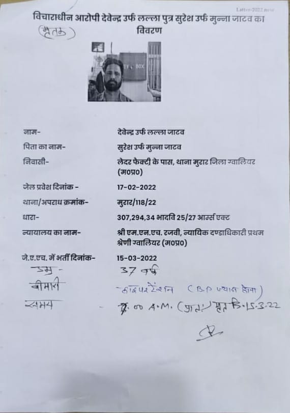 सेन्ट्रल जेल ग्वालियर अधीक्षक मनोज कुमार साहू के मुताबिक विचारधीन बंदी देवेंद्र जाटव 17 फरवरी को जेल में आया था। उस पर हत्या के प्रयास जैसा गंभीर आरोप था। कल रात को उसके सीने में तेज दर्द उठा तो उसे पहले जेल के अस्पताल में इलाज दिया फिर उसे तत्काल जयारोग्य अस्पताल इलाज के लिए भेजा जहाँ अस्पताल पहुंचते ही उसकी मौत हो गई।