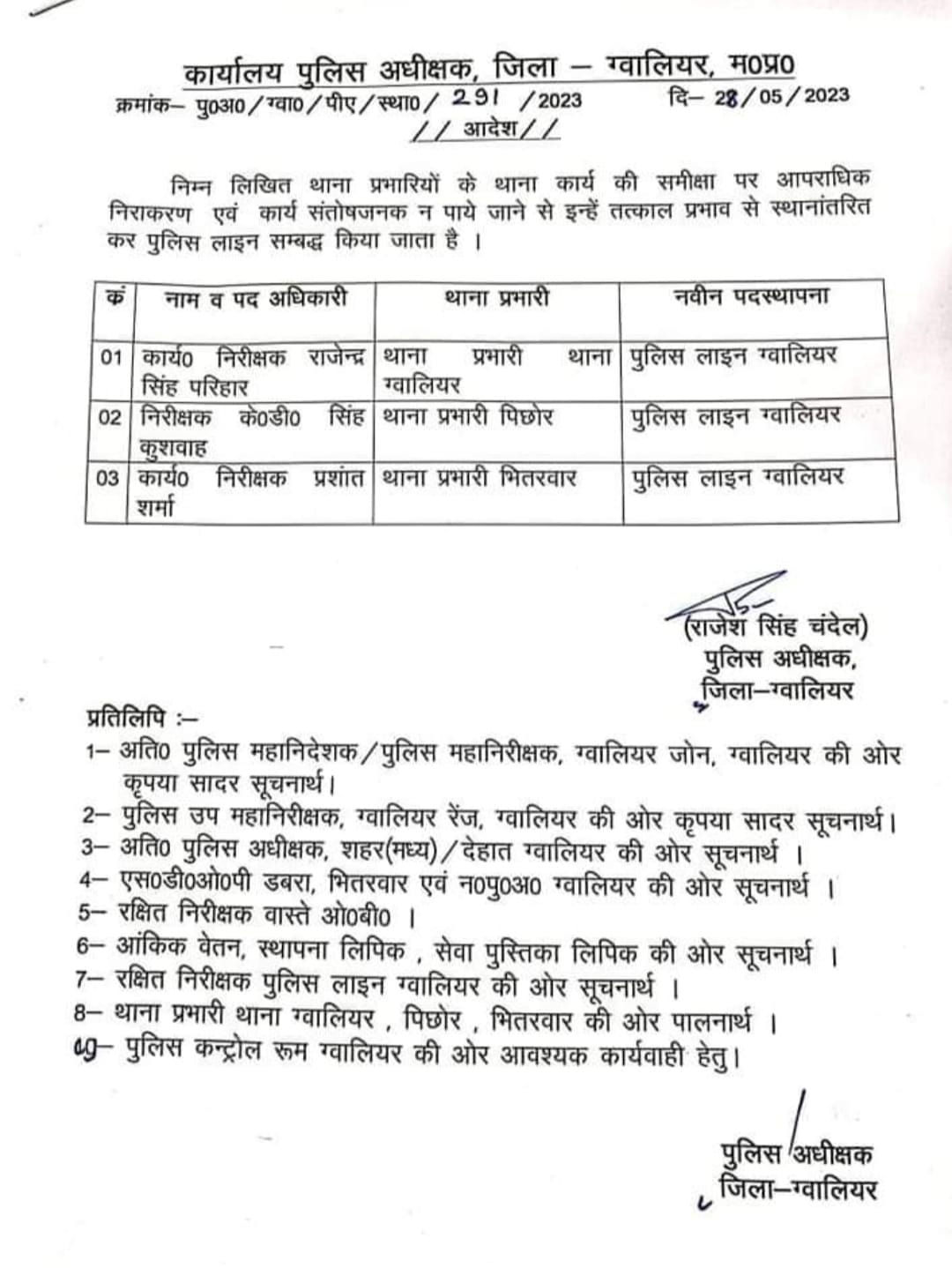 एसपी ने इन तीन थानों की समीक्षा के दौरान थाना प्रभारियों के अपराध पर निराकरण, नियंत्रण को संतोषजनक नहीं पाया और फिर थाना प्रभारी ग्वालियर राजेन्द्र सिंह परिहार, थाना प्रभारी पिछोर केडी सिंह और थाना प्रभारी भितरवार प्रशांत शर्मा को लाइन अटैच कर दिया यानि पुलिस लाइन भेज दिया।