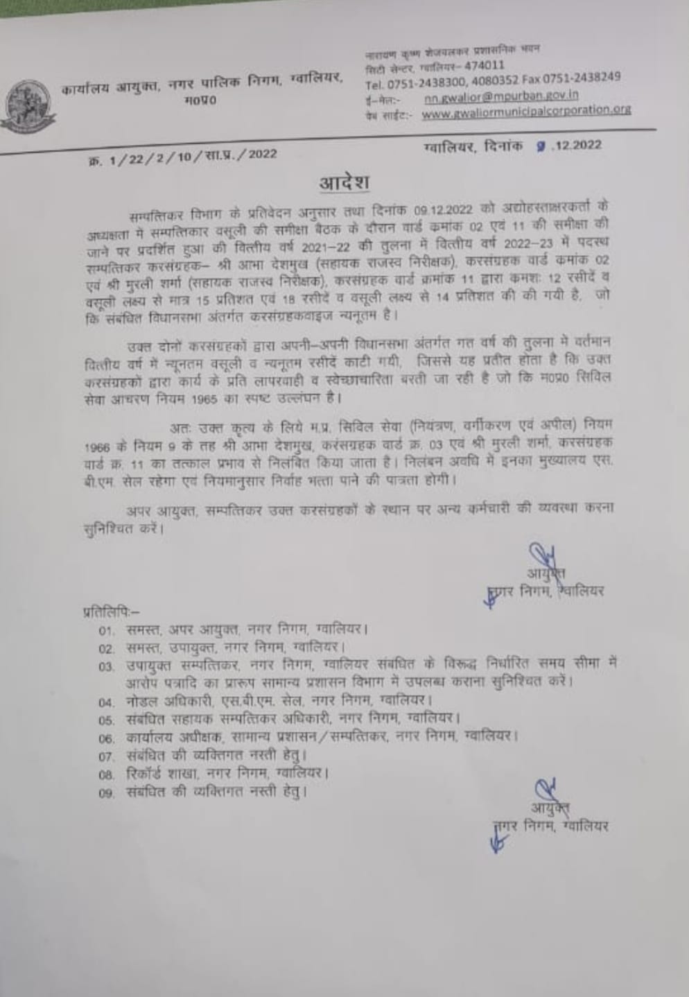 कमिश्नर के आदेश में लिखा है कि वित्तीय वर्ष 2021-22 की तुलना में वित्तीय वर्ष 2022-23 में पदस्थ वार्ड क्रमांक दो के कर संग्रहक आभा देशमुख ने 12 रसीदें यानि लक्ष्य से मत 15 प्रतिशत और वार्ड क्रमांक 11 के कर संग्रहक मुरली शर्मा ने 18 रसीदें यानि लक्ष्य से मात्र 14 प्रतिशत वसूली की गई जो सम्बंधित विधानसभा में किसी भी कर संग्रहक की न्यूनतम वसूली है। जिससे स्पष्ट है कि उक्त दोनों कर संग्रहकों ने संपत्ति कर वसूली में पलार्वाही की है।