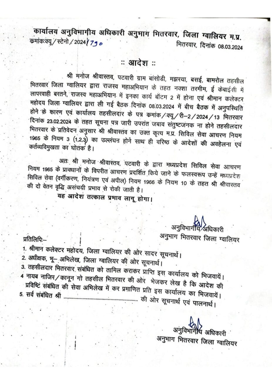 एक अन्य आदेश में SDM भितरवार ने ग्राम बांसोड़ी , बसई और बामरोल के पटवारी मनोज श्रीवास्तव को भी लापरवाही की सजा दी है, एसडीएम के आदेश में कहा गया है कि देश में कहा गया है कि राजस्व महा अभियान के दौरान पटवारी कैप्टन शाक्य ने नक्षा, तरमीम , ए-केवाईसी में लापरवाही बरती, राजस्व महा अभियान में इनका काम बॉटम 2 में पाया गया बावजूद इसके ये आज 8 मार्च को कलेक्टर द्वारा बुलाई गई बैठक में सूचना दिए जाने के बाद अनुपस्थित रहे इनका ये कार्य वरिष्ठ के आदेशों की अवहेलना है इसलिए मनोज श्रीवास्तव को दो वेतन व्रस्शी असंचयी प्रभाव से रोकी जाती हैं ये आदेश तत्काल प्रभाव से लागू होगा।
