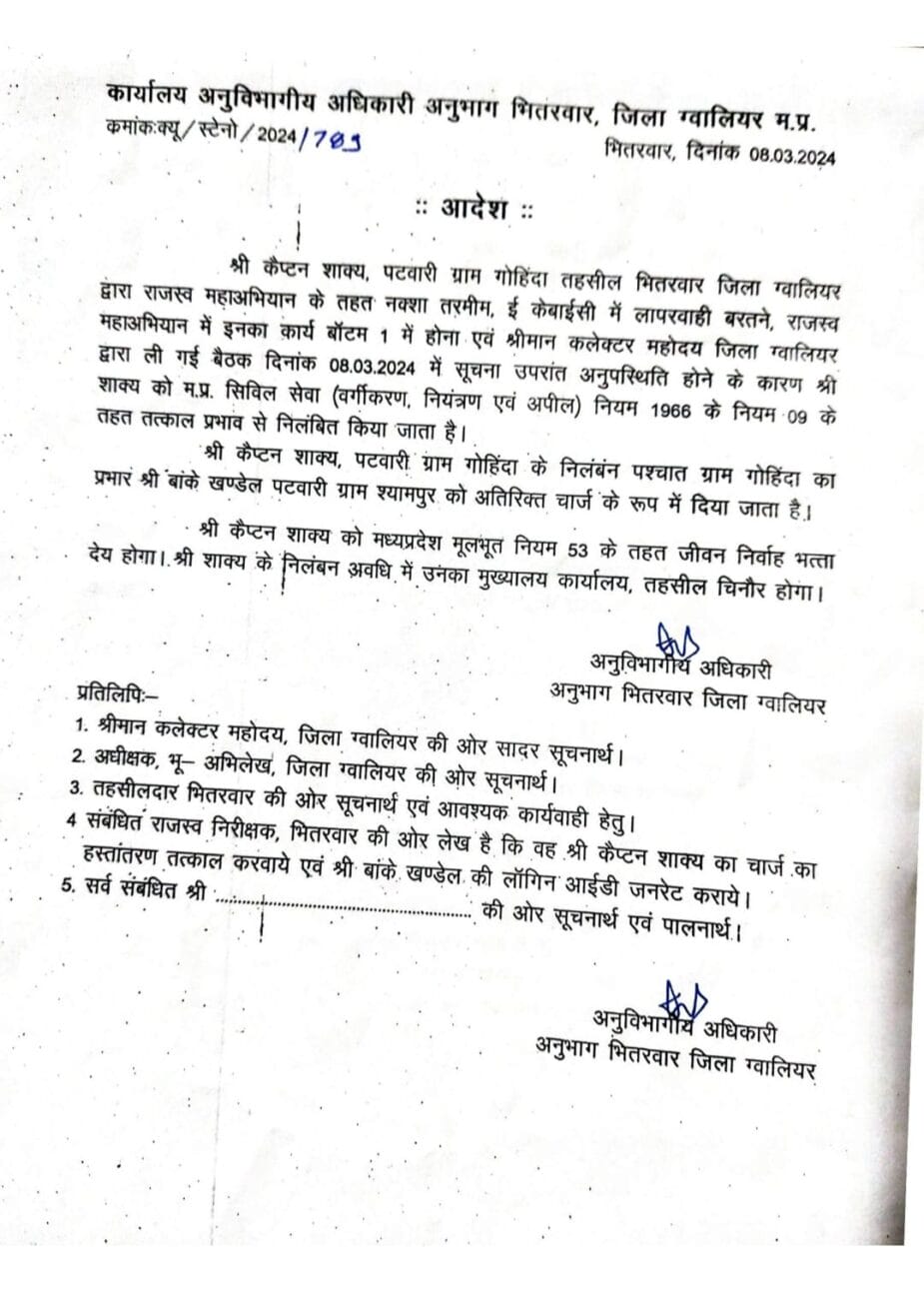 भितरवार एसडीएम कार्यालय से जारी आदेश में ग्राम गोहिंदा के पटवारी कैप्टन शक्य पर राजस्व महा अभियान में लापरवाही करने के आरोप लगाये गए है , आदेश में कहा गया है कि राजस्व महा अभियान के दौरान पटवारी कैप्टन शाक्य ने नक्षा, तरमीम , ए-केवाईसी में लापरवाही बरती, राजस्व महा अभियान में इनका काम बॉटम 1 में पाया गया बावजूद इसके ये आज 8 मार्च को कलेक्टर द्वारा बुलाई गई बैठक में सूचना दिए जाने के बाद अनुपस्थित रहे इसलिए इन्हें निलंबित किया जाता है, निलंबन अवधि में पटवारी कैप्टन शाक्य का कार्यालय चीनौर रहेगा, अगले आदेश तक ग्राम गोहिंदा का चार्ज ग्राम श्यामपुर के पटवारी बांके खंडेल के पास रहेगा।