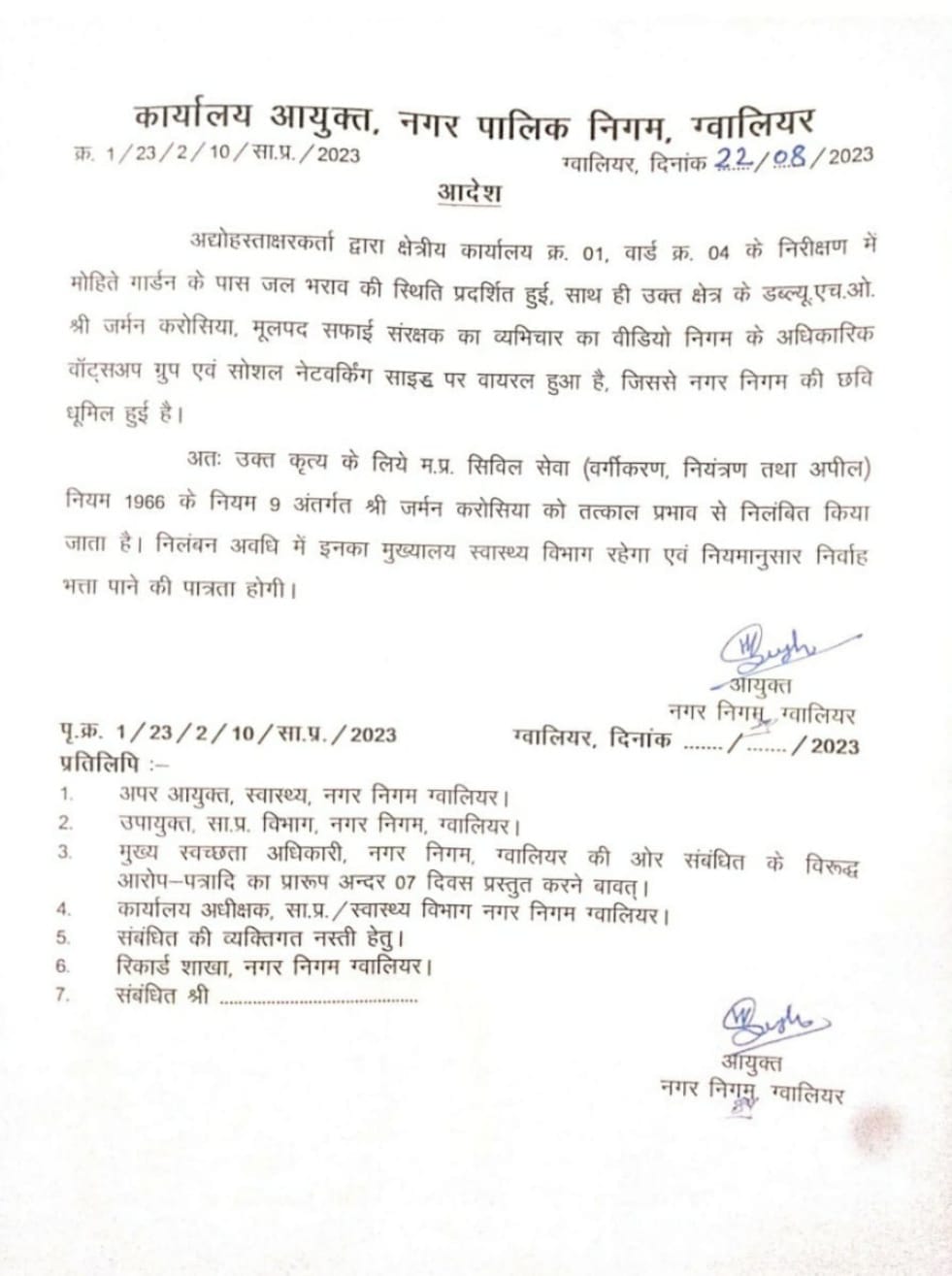 अश्लील वीडियो और क्षेत्र में लापरवाही सामने आने पर कमिश्नर हर्ष सिंह ने WHO (मूल पद सफाई संरक्षक) जर्मन करोसिया को तत्काल प्रभाव से निलंबित कर दिया और उसे निलंबन की अवधि तक के लिए स्वास्थ्य विभाग में भेज दिया है , करोसिया को निलंबन अवधि में नियमानुसार जीवन निर्वाह भत्ता मिलता रहेगा।
