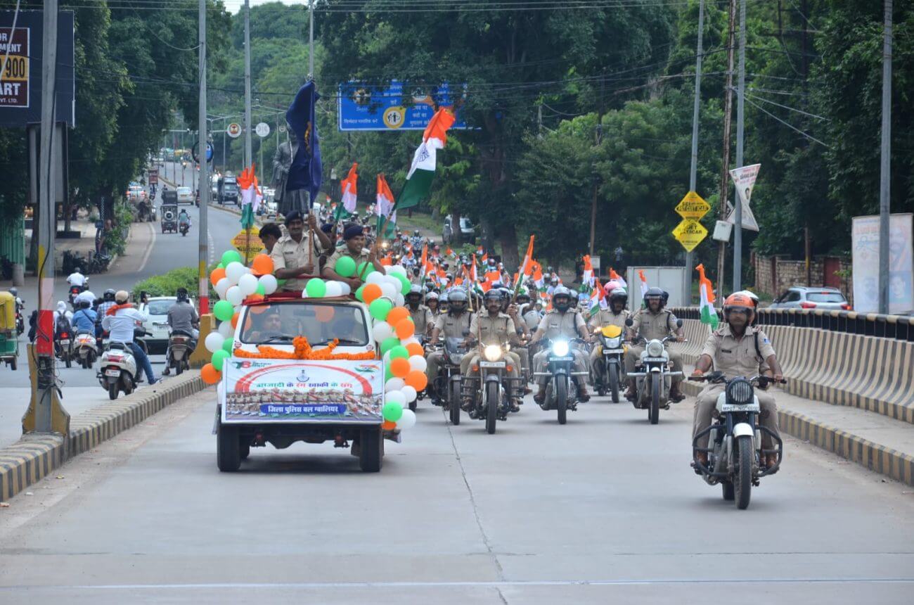 तिरंगा बाइक रैली शहर के विभिन्न भागों से गुजरती हुई पुलिस लाइन ग्वालियर में समाप्त हुई। एसपी ऑफिस, पुलिस कंट्रोल रूम से शुरू हुई ये बाइक रैली सिटी सेंटर, नदीगेट, पाटनकर चौराहा, दौलतगंज, बाड़ा, सराफा होते हुए फालका बाजार, गश्त का ताजिया, राम मंदिर चौराहा, शिन्दे की छावनी से पुलिस लाइन ग्वालिय में पहुंचकर समाप्त हुई । इस दौरान पुलिस अधिकारियों द्वारा आमजन से अपने घर, दुकान, व्यापारिक संस्थानों आदि पर झंडा लगाने की अपील की साथ ही आजादी के इस पर्व को हर्षोल्लास के साथ मनाने की समझाइश भी दी।