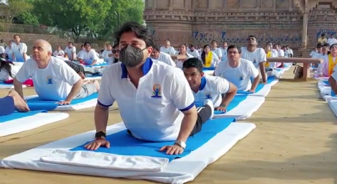 ग्वालियर, अतुल सक्सेना। अंतरराष्ट्रीय योग दिवस (International Yoga Day) के अवसर पर देश में कई जगह पर योग कार्यक्रम आयोजित किये गए। इस बार ऐतिहासिक स्थलों पर भी योग के विशेष सत्र आयोजित किये गए। प्रदेश में 75 ऐतिहासिक स्थलों पर भी योग कार्यक्रम हुए जिसमें केंद्रीय मंत्री और अन्य विशेष अतिथि शामिल हुए। इसी क्रम में ग्वालियर किले पर आयोजित योग कार्यक्रम में केंद्रीय नागरिक उड्डयन मंत्री ज्योतिरादित्य सिंधिया शामिल हुए। योग करने के बाद सिंधिया ने कहा कि योग सत्यम – शिवम् – सुंदरम का संगम है , ये त्रिवेदी का संगम है।