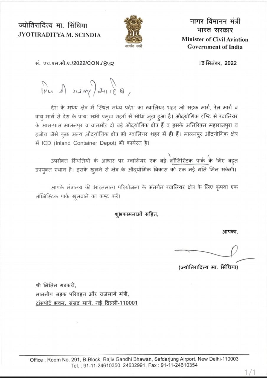 पत्र के अंत में केंद्रीय मंत्री ज्योतिरादित्य सिंधिया ने केंद्रीय मंत्री नितिन गडकरी से अनुरोध किया कि आपके मंत्रलय की भारतमाला परियोजना के अंतर्गत कृपया एक लॉजिस्टिक पार्क ग्वालियर क्षेत्र के लिए खुलवाने का कष्ट करें।