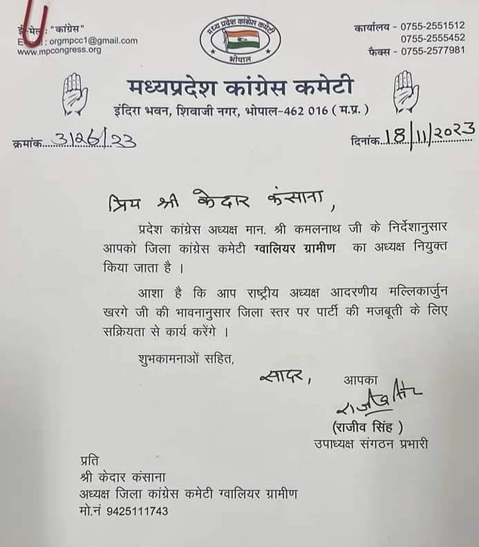 Gwalior News : मध्य प्रदेश कांग्रेस कमेटी के अध्यक्ष एवं पूर्व मुख्यमंत्री कमलनाथ ने ग्वालियर जिले के एक पुराने नेता के इस्तीफे को नामंजूर करते हुए उसका प्रमोशन कर दिया है। कमलनाथ ने ग्वालियर ग्रामीण क्षेत्र के दमदार नेता केदार कंसाना को ग्वालियर ग्रामीण जिला अध्यक्ष के पद पर नियुक्त किया है।