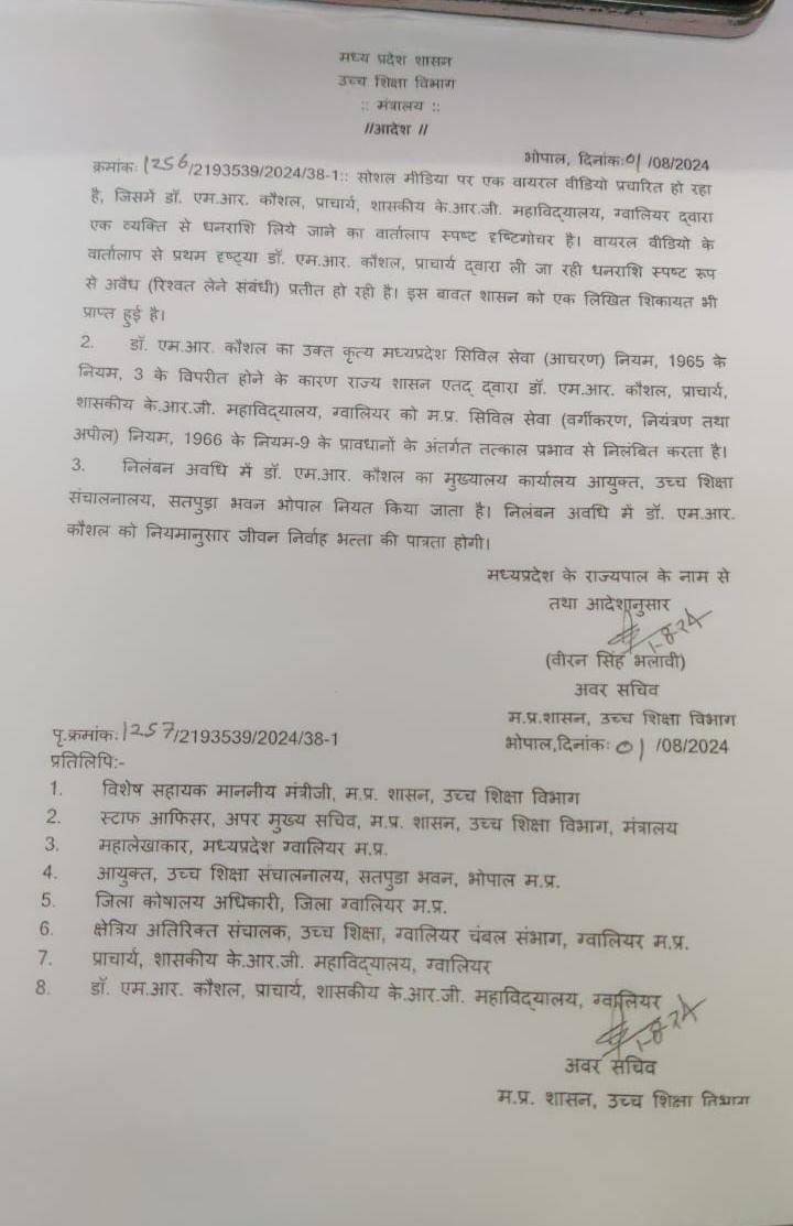 KRG College Gwalior Principal Dr MR Kaushal suspended: मप्र उच्च शिक्षा विभाग ने केआरजी कॉलेज ग्वालियर के प्रिंसिपल डॉ एम आर कौशल को निलंबित कर दिया है , निलंबन की ये कार्रवाई डॉ कौशल के रिश्वत लेते वायरल हुए वीडियो के बाद की गई है।