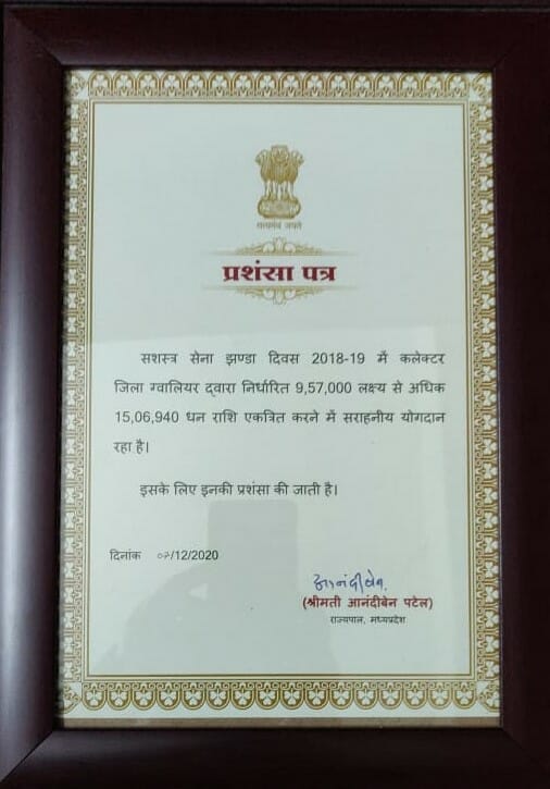 ग्वालियर, अतुल सक्सेना। ग्वालियर जिले (Gwalior District) ने लगातार चौथी बार सैनिक कल्याण के लिए धनराशि एकत्रित करने में लक्ष्य से अधिक उपलब्धि हासिल की है। इसके लिए ग्वालियर कलेक्टर कौशलेन्द्र विक्रम सिंह (Gwalior Collector Kaushlendra Vikram Singh) को प्रदेश के राज्यपाल की ओर से प्रशस्ति पत्र प्रदान किया गया है।