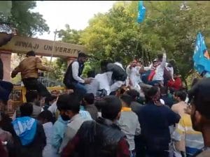 ग्वालियर, अतुल सक्सेना। जीवाजी विश्वविद्यालय (Jiwaji University Gwalior) में नव नियुक्त कुलपति अविनाश तिवारी को हटाने की मांग को लेकर NSUI ने आज मंगलवार को जीवाजी विश्वविद्यालय का घेराव किया और जमकर हंगामा किया। प्रदर्शनकारी छात्रों ने पुलिस बैरिकेड तोड़ने की कोशिश की तो पुलिस ने उनपर वाटर केनन से पानी की बौछार की और लाठी चार्ज कर गिरफ्तार कर लिया।