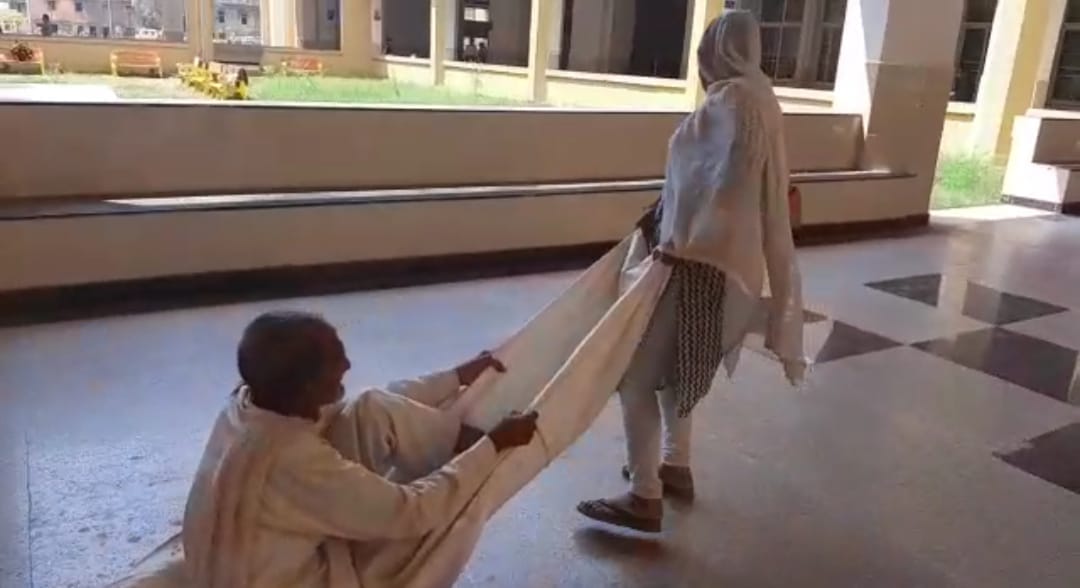 ससुर की तकलीफ से परेशान बहू ने उनके पास मौजूद एक सफ़ेद चादर का स्ट्रेचर बनाया , उस पर ससुर श्रीकृष्ण ओझा को बैठाया और घसीटते हुए 1000 बिस्तर के अस्पताल के बाहर की तरफ ले जाने लगी, तभी किसी ने ये वीडियो बना लिया जो अब सोशल मीडिया पर वायरल हो रहा है और सरकारी दावों की पोल खोल रहा है।