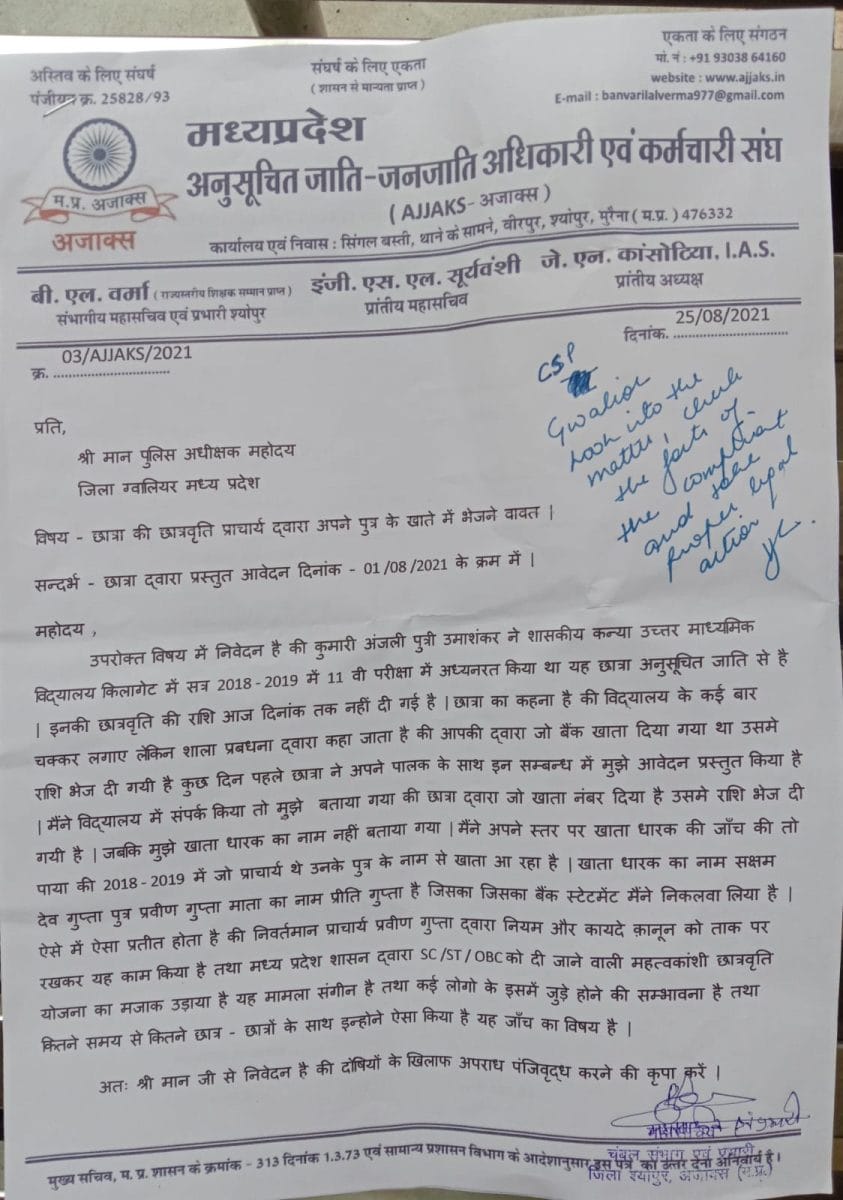 अनुसूचित जाति जनजाति अधिकारी कर्मचारी संघ अजाक्स के संभागीय महासचिव बीएल वर्मा ने एक शिकायती आवेदन एसपी अमित सांघी को दिया है। उन्होंने बताया कि शासकीय कन्या उच्चतर माध्यमिक विद्यालय किला गेट ग्वालियर में पढ़ने वाली अंजलि ने इस विद्यालय से 1018 – 19 कक्षा 11वीं पास किया है। उसे शासन से मिलने वाली स्कॉलरशिप नहीं दी गई।