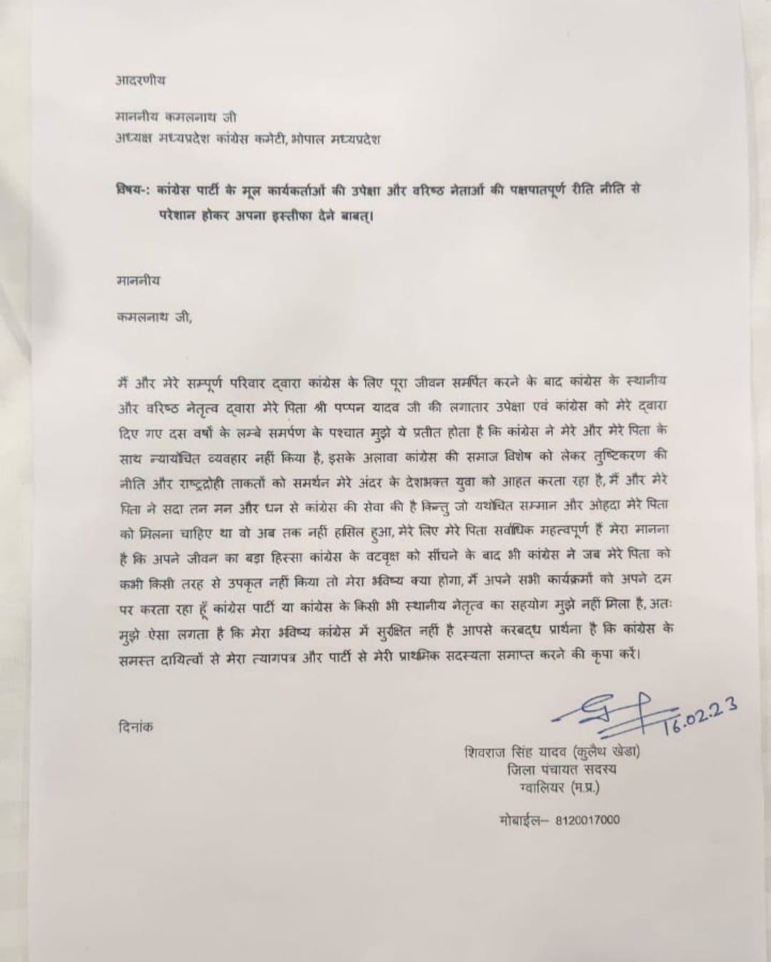 ग्वालियर जिला पंचायत के सदस्य शिवराज सिंह यादव ने आज कांग्रेस की प्राथमिक सदस्यता से इस्तीफा दे दिया, उन्होंने प्रदेश कांग्रेस अध्यक्ष कमल नाथ को अपना इस्तीफा भेजते हुए पार्टी के लोगों पर कई गंभीर आरोप लगाये। अपने इस्तीफे में शिवराज यादव ने पार्टी के मूल कार्यकर्ताओं की इस समय उपेक्षा की जा रही है उनके साथ पक्षपातपूर्ण व्यवहार किया जा रहा है।