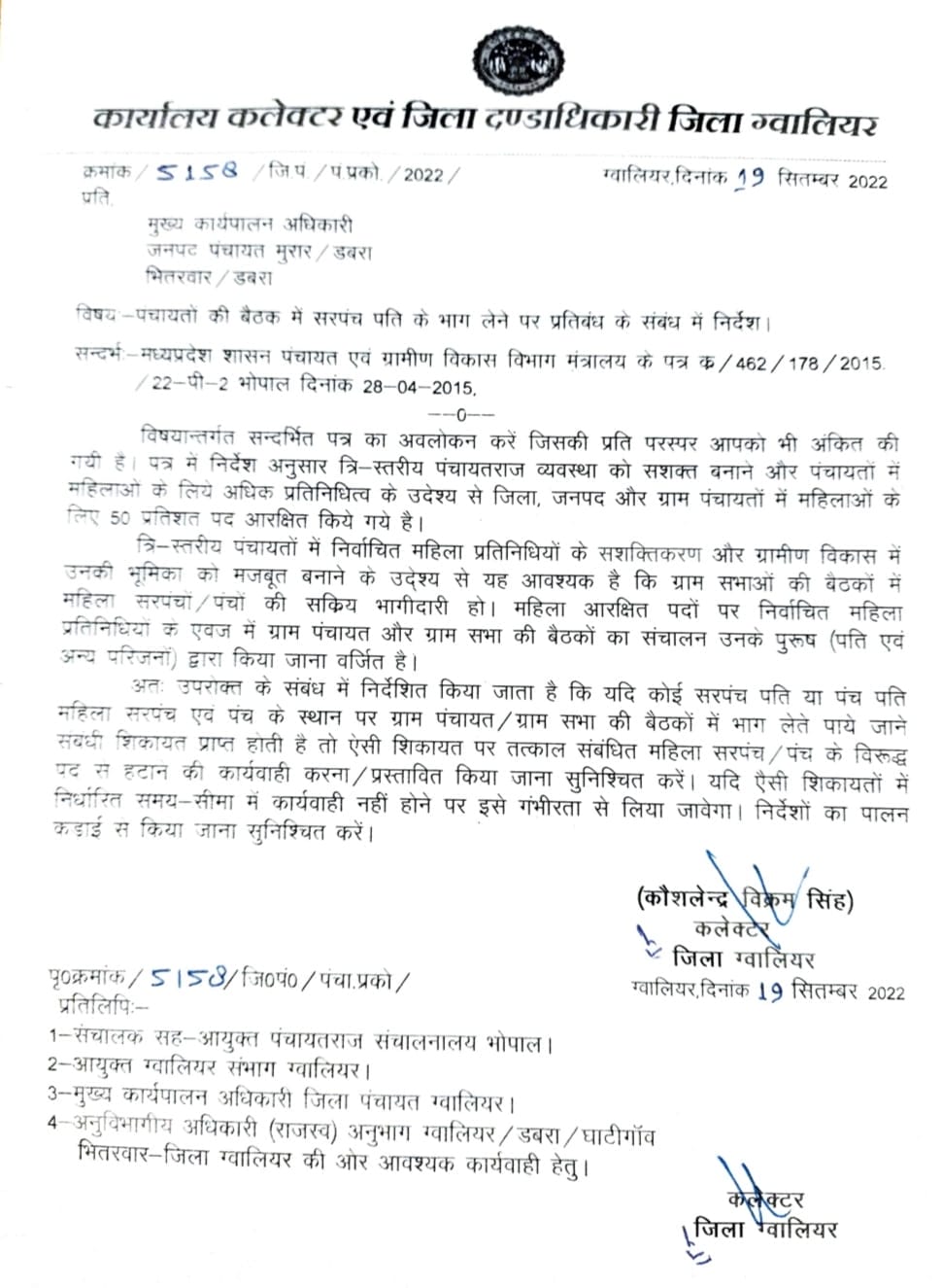कलेक्टर ने ग्वालियर जिले के अंतर्गत आने वाली जनपद पंचायतों के मुख्य कार्यपालन अधिकारी को आदेश दिया है कि यदि इस तरह की कोई शिकायत आती है तो तत्काल सम्बंधित महिला सरपंच/पंच के विरुद्ध पद से हटाने की कार्यवाही प्रस्तावित करें। ऐसे मामलों में समय सीमा में कार्यवाही नहीं किये जाने पर इसे गंभीरता से लिया जायेगा। इसलिए निर्देशों का पालन कड़ाई से किया जाए।