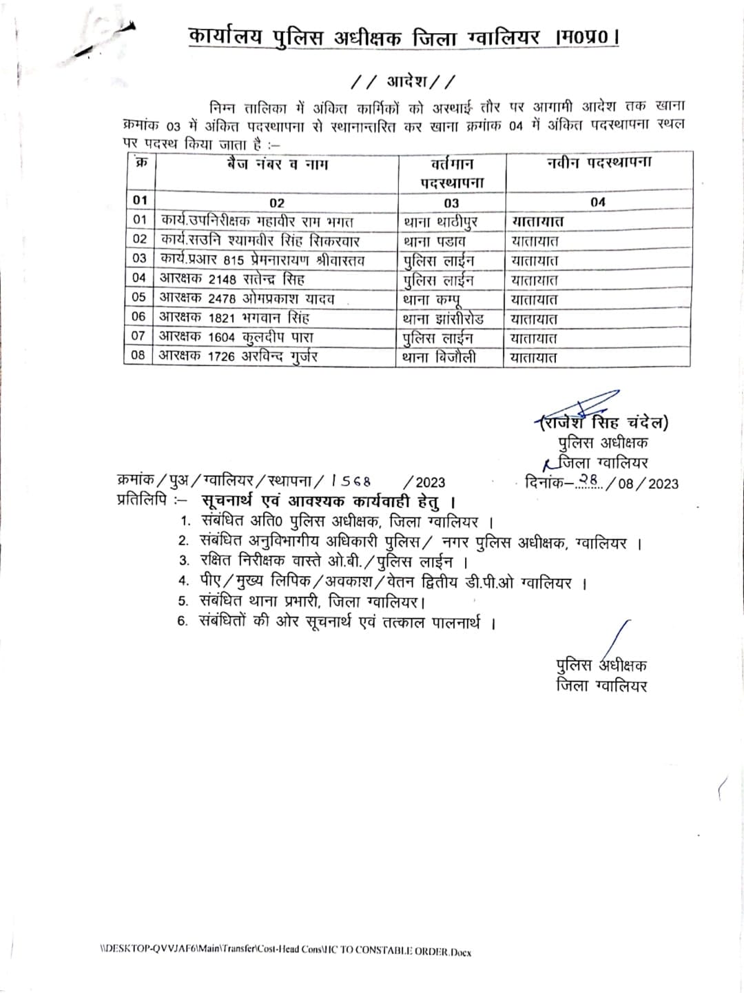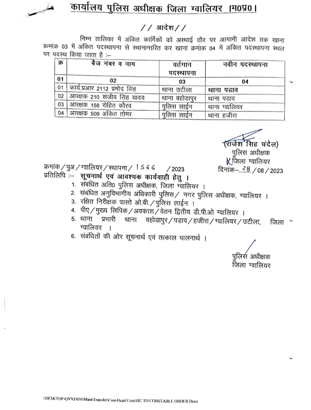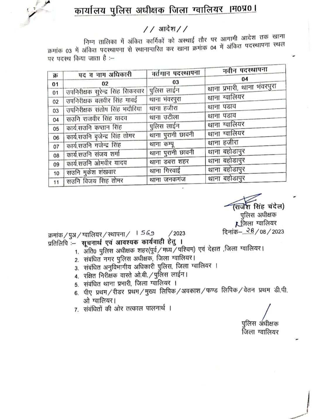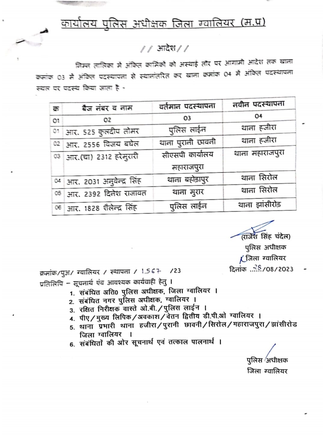 ग्वालियर पुलिस अधीक्षक राजेश सिंह चंदेल ने जिले में आज आरक्षकों, प्रधान आरक्षकों, सहायक उप निरीक्षकों और उप निरीक्षकों के तबादलों की सूची जारी की है, चार अलग अलग तबादला आदेश में 14 आरक्षक, 02 प्रधान आरक्षक, 09 सहायक उप निरीक्षक और 04 उप निरीक्षकों के नाम शामिल हैं।