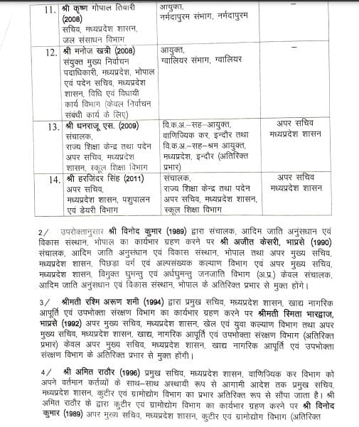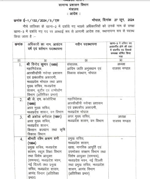 सामान्य प्रशासन विभाग द्वारा जारी आदेश के तहत अपर मुख्य सचिव अशोक बर्णवाल को एक बार फिर वन विभाग और डॉ. सुदाम पंढरीनाथ खाड़े को आयुक्त जनसंपर्क नियुक्त किया गया है।अपर मुख्य सचिव जेएन कंसोटिया (1989 बैच ) और विनोद कुमार (1989 बैच ) को मंत्रालय से बाहर भेजा गया है। कंसोटिया अब महानिदेशक प्रशासन अकादमी और विनोद कुमार को संचालक आदिम जाति अनुसंधान एवं विकास संस्थान की जिम्मेदारी संभालेंगे।