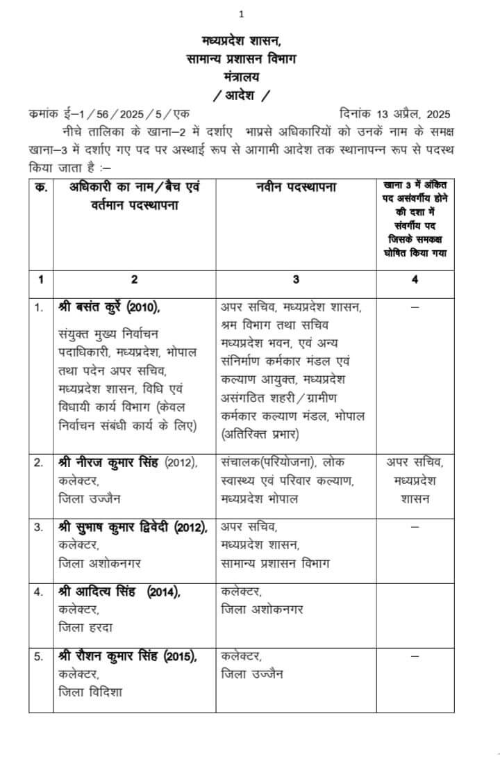 - सुभाष कुमार द्विवेदी – कलेक्टर, अशोकनगर से अपर सचिव, सामान्य प्रशासन विभाग।