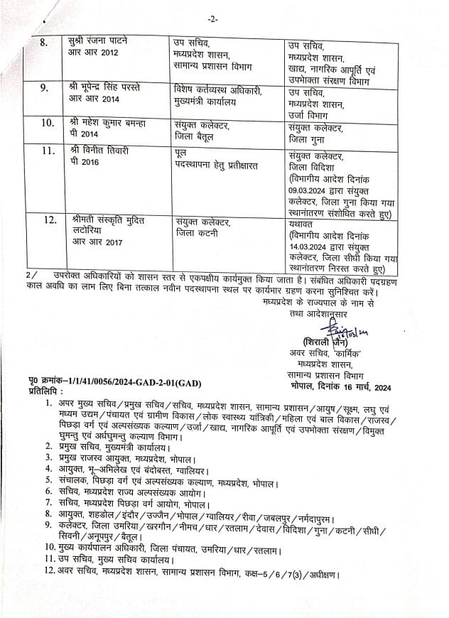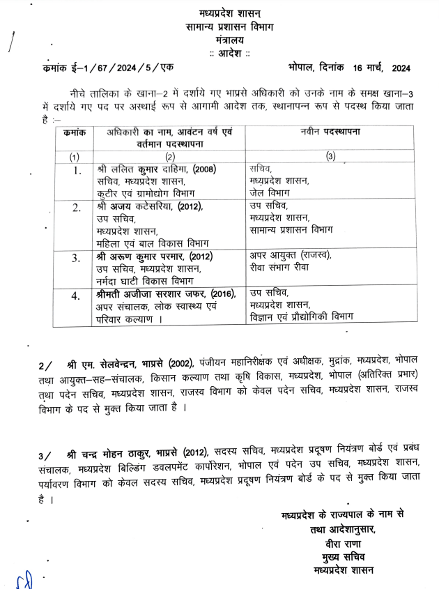 सामान्य प्रशासन विभाग की तरफ से जारी आदेश में 2008 बैच के अधिकारी ललित कुमार दाहिमा को सचिव जेल विभाग, धनंजय सिंह भदौरिया को आयुक्त अनुसूचित जाति विकास तथा प्रबंध संचालक मध्य प्रदेश राज्य अनुसूचित जाति वित्त एवं विकास निगम भोपाल का अतिरिक्त प्रभार,अमन वैष्णव को अपर कलेक्टर अनूपपुर और अभय सिंह ओहरिया मुख्य कार्यपालिका अधिकारी जिला पंचायत उमरिया बनाया है।