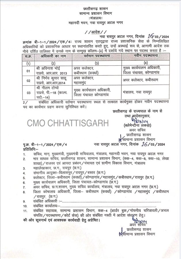 छग सामान्य प्रशासन विभाग द्वारा जारी आदेश के मुताबिक, कबीरधाम अपर कलेक्टर अविनाश भोई को बतौर जिला पंचायत मुख्य कार्यपालन अधिकारी कोंडागांव, महासमुंद अपर कलेक्टर निर्भय कुमार साहू को कबीरधाम जिले का अपर कलेक्टर और कोंडागांव के मुख्य कार्यपालन अधिकारी नीलम टोप्पो को मंत्रालय नवा रायपुर की जिम्मेदारी सौंपी गई है।