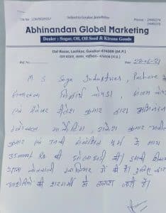 शिकायटी आवेदन में कहा गया है कि एम एस सोया इंडस्ट्रीज पचोर के संचालक सिद्धार्थ चोपड़ा, संजय चोपड़ा एवं प्रबंधक रितेश कुमार द्वारा अभिनंदन ग्लोबल मार्केटिंग के राकेश कुमार जैन, अजीत कुमार एवं उनकी संबंधित फर्मों के साथ तेल का सौदा किया गया था। जिसमें तेल का स्टॉक पहुंच जाने के बाद भुगतान करने से न सिर्फ इंकार कर दिया गया बल्कि अभिनंदन ग्लोबल मार्केटिंग के प्रतिनिधि देवेंद्र कुमार जब एम एस सोया पचोर की फैक्ट्री पर गए तो वहां पर प्रबंधक ने उनके प्रतिनिधि के हस्ताक्षरयुक्त एक फर्जी रसीद थमा दी। जिससे स्पष्ट है कि इसमें फर्जीवाड़ा किया गया।