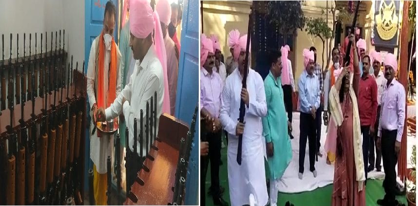 इंदौर, आकाश धोलपुरे। आज 15 अक्टूबर को विजयादशमी (Dussehra) के पर्व पर इंदौर की पुलिस लाईन में वरिष्ठ अधिकारीयों द्वारा माता पूजन के बाद परंपरागत तरीके से शस्त्रों (weapons) की पूजन की गई। शस्त्र पूजन में पुलिस अधिकारी औऱ समस्त कर्मचारी मौजूद रहे। हर साल की तरह इस साल भी विजयदशमी के दिन परम्परागत तरीके से जिला पुलिस ने डीआरपी लाइन में शस्त्रों का पूजन कर हवाई हर्ष फायर किये। इस दौरान आईजी हरिनारायण चारि मिश्रा, डीआईजी मनीष कपूरिया सहित वरिष्ठ पुलिस अधिकारी व कर्मचारी मौजूद रहे।