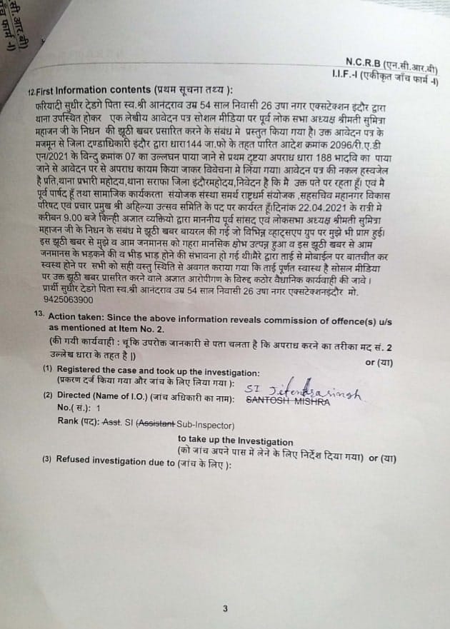 वही सामाजिक कार्यकर्ता सुधीर देड़गे ने आईजी इंदौर हरिनारायणचारि मिश्रा से भी फोन पर चर्चा कर शिकायत की है। सराफा थाने में दर्ज कराई गई एफआईआर में पूर्व लोकसभा अध्यक्ष सुमित्रा महाजन “ताई जी’ के निधन की अफवाह फैलाने वाले अज्ञात व्यक्ति को शीघ्र पकड़कर कठोर कार्यवाही करने की मांग की है।