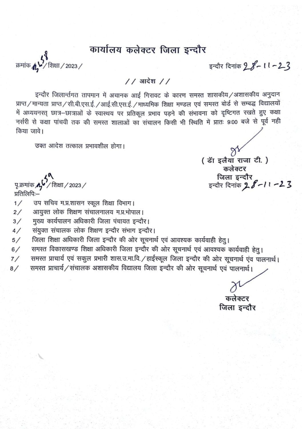 इंदौर कलेक्टर डॉ इलैया राजा टी ने आज आदेश जारी कर कहा कि जिले के तापमान में अचानक आई गिरावट के कारण सभी शासकीय, अशासकीय अनुदान प्राप्त, मान्यता प्राप्त, सीबीएसई, आईसीएसई, एमपी बोर्ड सहित सभी अन्य बोर्ड से सम्बद्ध सभी स्कूलों में पढ़ने वाले बच्चों के स्वास्थ्य पर प्रतिकूल प्रभाव पड़ने की सम्भावना को देखते हुए नर्सरी से पांचवी तक के सभी स्कूल अब से सुबह 9 बजे से पहले नहीं खुलेंगे।