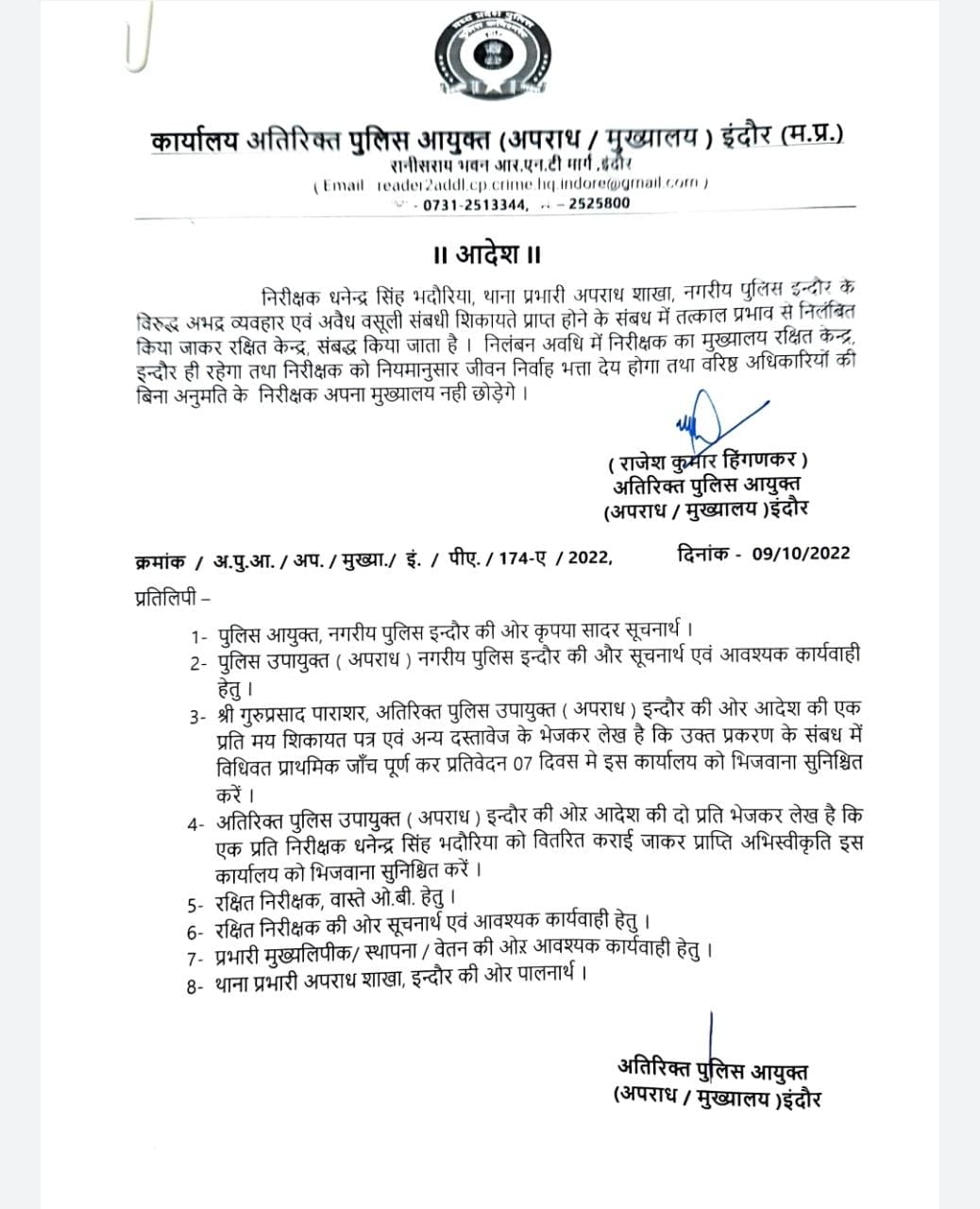इंदौर, डेस्क रिपोर्ट। आखिरकार इंदौर क्राइम ब्रांच TI धनेंद्र सिंह भदौरिया को निलंबित कर दिया गया है रविवार सुबह इसका आदेश जारी कर दिया गया, अतिरिक्त पुलिस आयुक्त राजेश हिगणकर ने यह आदेश जारी किया है इस आदेश में लिखा है कि धनेद्र सिंह भदौरिया थाना प्रभारी अपराध शाखा नगरीय पुलिस इंदौर के विरुद्ध अभद्र व्यवहार एवं अवैध वसूली संबंधी शिकायतें प्राप्त होने के संबंध में तत्काल प्रभाव से निलंबित किया जाता है, इन्हे रक्षित केंद्र संबंद्ध किया जाता है।