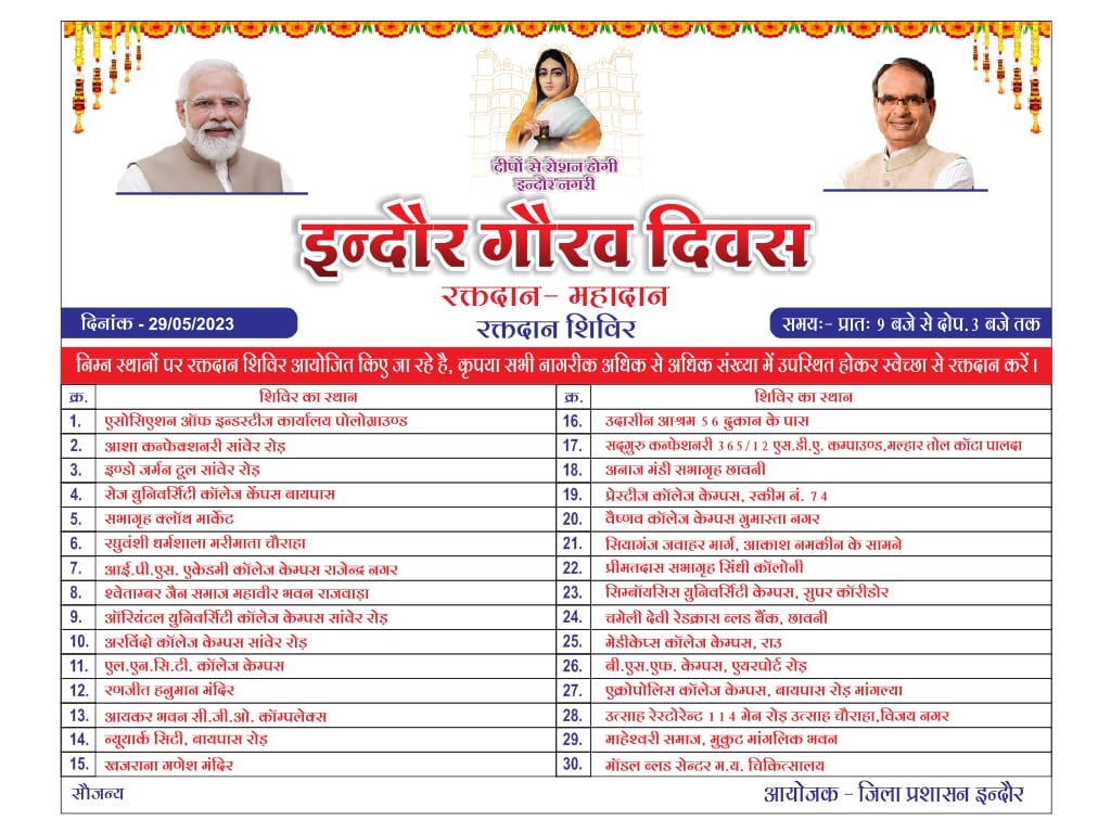 Indore Gaurav Diwas : इंदौर स्थापना दिवस के अवसर पर 25 मई से शुरू हुए का अलग-अलग कार्यक्रमों की कड़ी में आज शहर के 30 स्थानों पर रक्तदान शिविर आयोजित किए गए हैं। जिसमें सुबह से ही लोग रक्तदान के लिए पहुंचने लगे हैं। वहीं, कलेक्टर ने जनता से अपील की है कि अधिक से अधिक लोग रक्तदान करें। बता दें कि रक्तदान महादान शिविर सुबह 9 बजे से शुरू हो चुके हैं और शाम तक इंदौरियों द्वारा हजारों की संख्या में रक्तदान कर एक नया कीर्तिमान रचा जाएगा। वहीं, खजराना गणेश मंदिर और अन्य संस्थानों द्वारा 30 स्थानों पर रक्तदान शिविर आयोजित किए गए हैं।