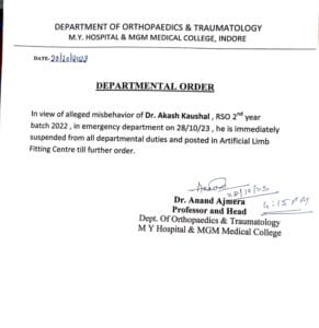 शनिवार को मरीज के साथ डॉक्टर की मारपीट का वीडिया वायरल होने के बाद आर्थोपैडिक विभाग के अध्यक्ष ने डॉक्टर की अनुशासन हीनता को देखते हुए निलंबित कर दिया गया। आगामी आदेश तक डॉक्टर को कृत्रिम अंग फिटिंग में तैनात कर दिया गया है। इस घटना के बाद अधिष्ठाता मेडिकल कॉलेज, इंदौर ने जांच समिति का गठन किया है। जिसकी रिपोर्ट तीन दिन में पेश करने को कहा गया है। आरएसओ द्वितीय बैच के डॉक्टर आकाश कौशल की नियुक्ति आपातकालीन विभाग में हुई थी।