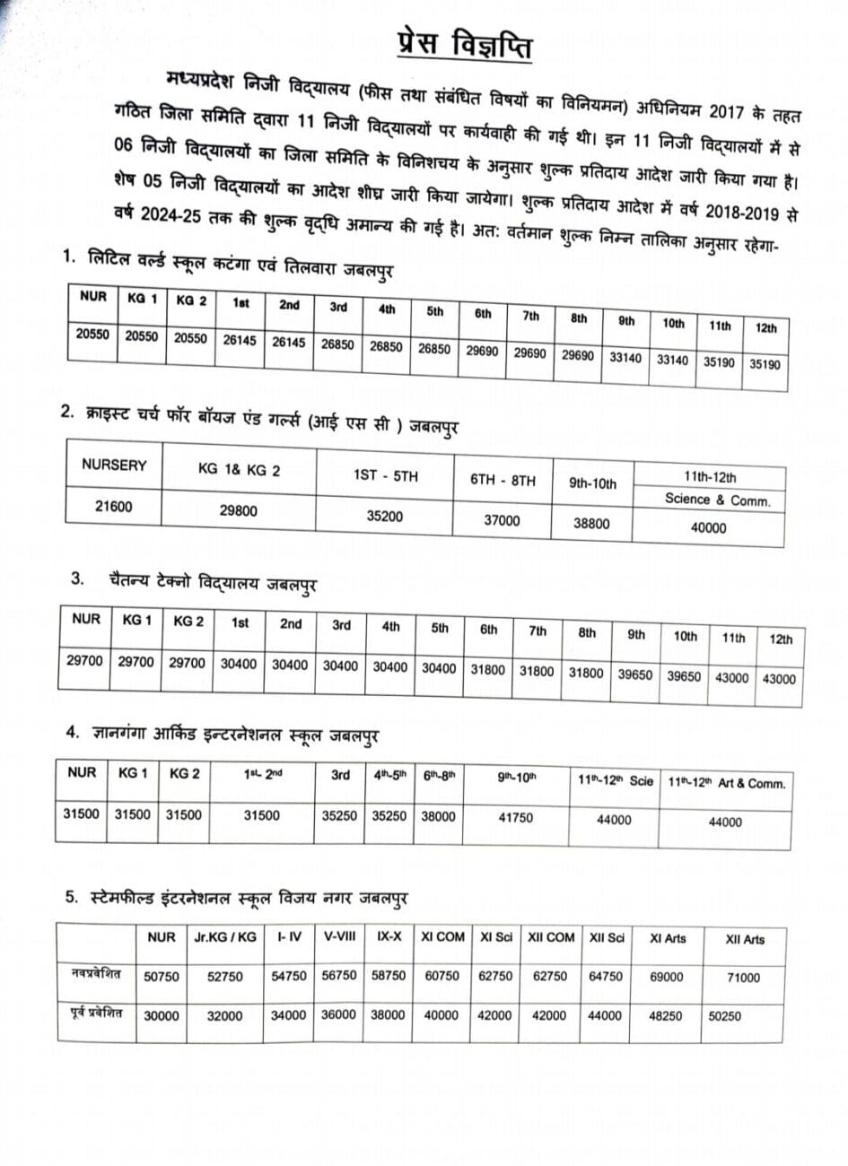 Jabalpur News : जबलपुर जिला कलेक्टर द्वारा जिन स्कूलों पर नियम विरुद्ध जाकर स्टूडेंट्स से करोड़ों रुपये की फ़ीस वसूलने पर एक्शन लिया गया था अब उसमें प्रशासन ने एक और बड़ा एक्शन लिया है। प्रशासन ने जिला समिति की रिपोर्ट मिलने के बाद 11 में से 6 स्कूलों की फ़ीस वृद्धि को अमान्य घोषित कर दिया है, अब इन स्कूलों की फ़ीस का निर्धारण नए सिरे से किया गया है, शेष 5 स्कूलों की रिपोर्ट जल्दी ही आएगी, उसके बाद उनके नियमानुसार एक्शन लिया जायेगा।