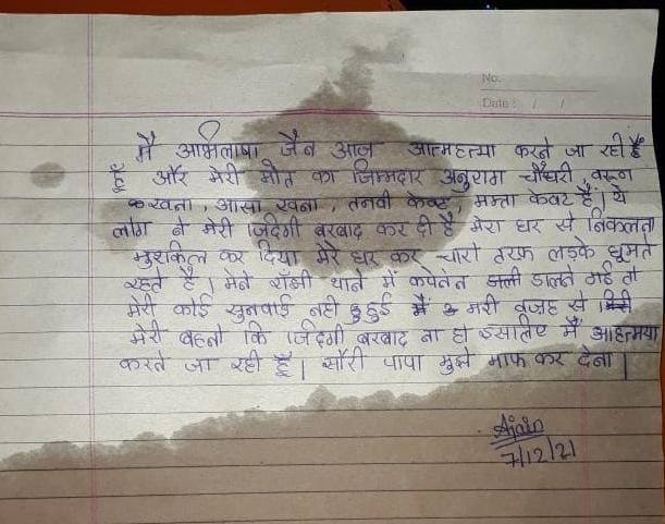 समय रहते अगर रांझी पुलिस ने इस छात्रा के आवेदन पर कार्रवाई कर दी होती तो शायद आज वो मेडिकल अस्पताल में जिंदगी और मौत से न जूझ रही होती, करीबन 90 प्रतिशत जल चुकी इस छात्रा ने अपने सुसाइड नोट में साफ लिखा है कि किस तरह उसका जीना आरोपियों ने मुश्किल कर रखा है और रांझी पुलिस ने भी उसकी कोई सुनवाई नही की, शोहदों से त्रस्त इस छात्रा ने सुसाइड नोट में यह भी लिखा कि मैं यह कदम इसलिए उठा रही हूं कि मेरी बहनों की जिंदगी बर्बाद न हो, कितना मुश्किल वक़्त रहा होगा अभिलाषा के लिए की उसे लगा कि उसके जीते जी तो पुलिस ने उसकी सुनी नही शायद उसके इस कदम के बाद पुलिस कार्रवाई करे और उसकी बहने तो कम से कम शोहदों की हरकतों से बच जाए।