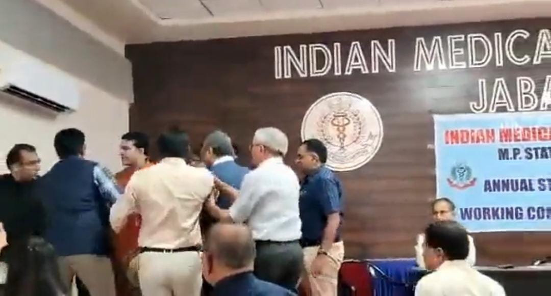 जबलपुर, डेस्क रिपोर्ट। जबलपुर (Jabalpur) में IMA के पदाधिकारियों के बीच जमकर हाथापाई होने की जानकारी सामने आई है। यहां पर IMA MP State के Annual State Council WCM, IMA House में प्रांत अध्यक्ष के पदभार ग्रहण कार्यक्रम में जबरदस्त हंगामा देखा गया। बात इतनी बढ़ गई कि पदाधिकारियों के बीच मारपीट हो गई, जिसका वीडियो सोशल मीडिया पर वायरल होने लगा।