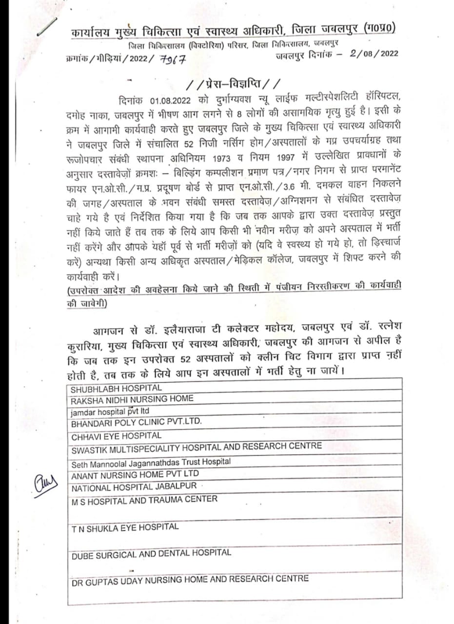 जबलपुर के न्यू लाइफ मल्टी स्पेशलिटी हॉस्पिटल में हुई भीषण आग की घटना के बाद जिला प्रशासन ने कड़े कदम उठाए हैं। कलेक्टर इलैयाराजा के निर्देश पर सीएमएचओ ने आदेश जारी किए हैं कि जबलपुर के 52 निजी अस्पतालों मे मरीजों की भर्ती पर तत्काल प्रतिबंध लगाया जाता है और इन अस्पतालों में जो भी मरीज भर्ती हैं उन्हें दूसरे अधिकृत अस्पतालों या मेडिकल कॉलेज जबलपुर में भर्ती करने के निर्देश दिए गए हैं ।ऐसा न करने पर इन अस्पतालों के पंजीयन निरस्तीकरण की कार्रवाई की जाएगी। आम जनता से भी अपील की गई है कि जब तक इन 52 अस्पतालों को क्लीन चिट विभाग द्वारा नहीं मिलती तब तक इन अस्पतालों में भर्ती के लिये न जाऐ। इन अस्पतालों में जबलपुर से मेयर पद के प्रत्याशी रह चुके डॉक्टर जामदार का अस्पताल भी शामिल है। सभी 52 अस्पतालों निजी नर्सिंग होम से सभी वे दस्तावेज मांगे गए हैं जो किसी भी अस्पताल के संचालन के लिए आवश्यक होते हैं। हालांकि इस आदेश के बाद जबलपुर के इन 52 निजी अस्पतालों में भर्ती मरीजों की व्यवस्था कैसे सुनिश्चित हो पाएगी, एक बड़ा सवाल है क्योंकि बड़ी संख्या में निजी अस्पतालों में मरीजों का इलाज चल रहा है और सरकारी तंत्र क्या इतना सक्षम है कि वह इन मरीजों के दबाव को झेल पाएगा। लेकिन फिलहाल कलेक्टर ने जिससे कङाई के साथ ही कार्रवाई की है उसकी प्रशंसा की जा रही है। गौरतलब है कि जिन 52 निजी अस्पताल और नर्सिंग होम्स को नोटिस जारी किया गय है, उनमें शहर के लगभग सभी बड़े अस्पताल है, जो ना सिर्फ भाजपा नेताओं के है, बल्कि कई रसूखदारों और बड़े नेताओं का का इन अस्पताल संचालकों के सिर पर हाथ है यही कारण है कि इनकी शिकायते मिलने के बावजूद आज तक इन पर कार्रवाई नहीं की गई।