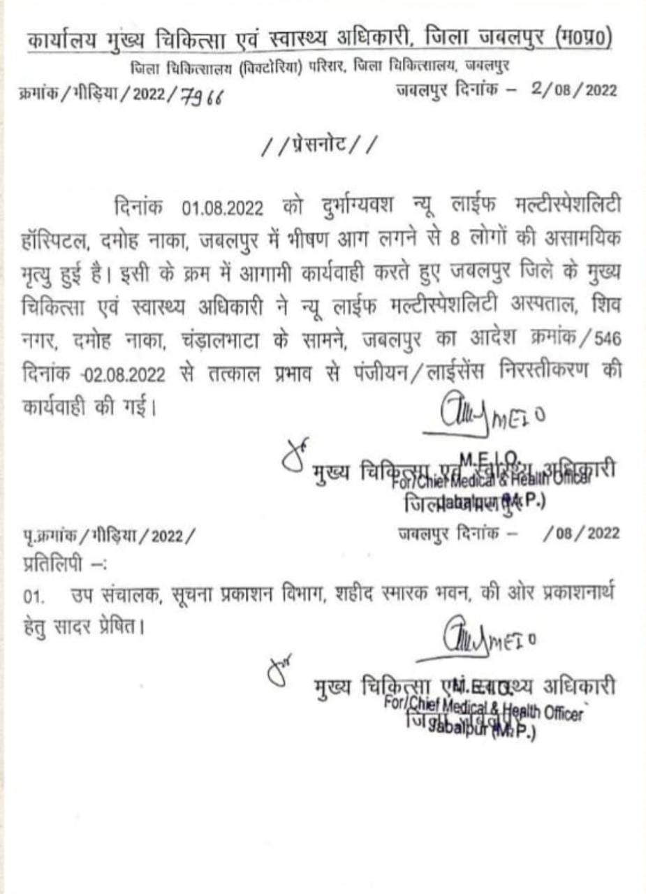 जबलपुर, डेस्क रिपोर्ट। जबलपुर शहर में सोमवार को दमोहनाका चंडालभाटा इलाके में स्थित न्यू लाइफ मल्टी स्पेशलिटी अस्पताल में हुए अग्निकांड के बाद मुख्य चिकित्सा एवं स्वास्थ्य अधिकारी कार्यालय ने मंगलवार को अस्पताल का लाइसेंस और पंजीयन रद्द कर दिया। गौरतलब है कि इस अग्निहादसे में 8 लोगों की जान चली गई थी वही 10 से ज्यादा लोग गंभीर रूप से घायल हो गए थे।